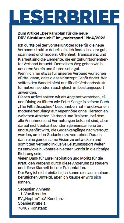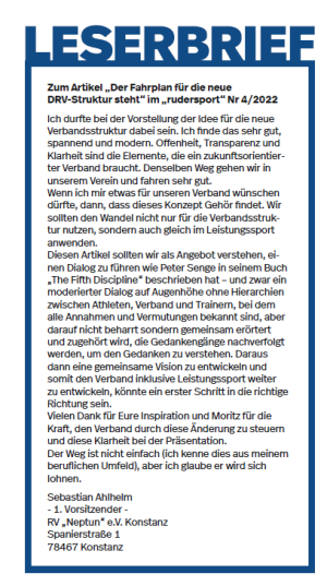 Martina Schott: Ich habe das gar nicht so aufgefasst. Eigentlich ist die Dichte in Bezug auf Rückmeldungen davon unberührt, da man jederzeit anrufen kann. Man kann also mit der Person, mit der man unzufrieden ist, in Kontakt treten, aber auch den Arbeitsrudertag dazu nutzen, oder den Rudertag selbst, man kann den Aufsichtsrat anrufen, man kann den Länderrat anrufen oder den Vereinsrat, falls er gebildet wird, und nicht zuletzt den hauptamtlichen Vorstand. So viele Zugriffsrechte hatten wir noch nie. Wir haben uns dafür entschieden, weil wir agiler werden wollen. Wenn wir nur alle vier Jahre Fachressorts gründen können, sind wir mit manchen Themen zu spät dran. Wir wollen die Gründung aber auch die Auflösung von Fachressorts davon abhängig machen, welche strategischen Ziele handlungsrelevant sind und was wir auf der operativen Ebene an Unterstützung brauchen. Darum haben wir die Fachressorts auf das operative Ehrenamt gehoben und ich bin auch dafür, stets Rückmeldung auf die Arbeitsleistung zu geben und jemandem gegebenenfalls auch nahezulegen, sich mehr zu zeigen oder sich auch aus einer Funktion zu verabschieden. Das finde ich besser, als wenn solche Themen aus einer zu großen Entfernung affekt- oder impulsgetrieben zur Sprache kommen.