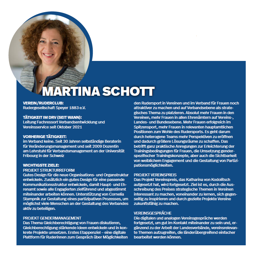 Martina Schott: Die erste größere Veränderung ist die angesprochene Kommunikation. Es wird außerdem eine engere Abstimmung in der Setzung von Zielen geben und eine Bilanzierung des Zielerreichungsgrades. Da gab es bis jetzt größere Freiräume innerhalb der Fachressorts, jetzt streben wir eine engere Verknüpfung an zwischen dem Auftrag des Arbeits- und des Wahlrudertages und den strategischen Vorgaben des Aufsichtsrates sowie der Budgetverantwortung des hauptamtlichen Vorstandes. Das kann im positiven Falle sein, dass wir wichtige zielunterstützende Projekte stark forcieren. Es kann im negativen Fall auch sein, dass jemand ein liebevoll gepflegtes Projekt hintenanstellen muss, weil es zu den aktuellen Jahreszielen nicht passt. Bis zu einem gewissen Grad nehmen Freiheitsgrade ab, nicht aber in der Ausführung. Denn die Ehrenamtlichen, die ich bisher erleben durfte, sind häufig sehr gesettelt, kreativ und spannend.