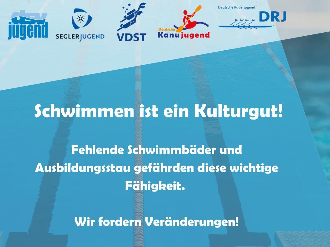 Die Deutsche Ruderjugend beteiligt sich gemeinsam mit anderen Jugendorganisationen der Wassersporttreibenden Spitzenverbänden (Kanu, Schwimmen, Segeln und Sporttauchen) am Forderungskatalog zur Förderung der Schwimmfähigkeit und von Schwimmbädern.