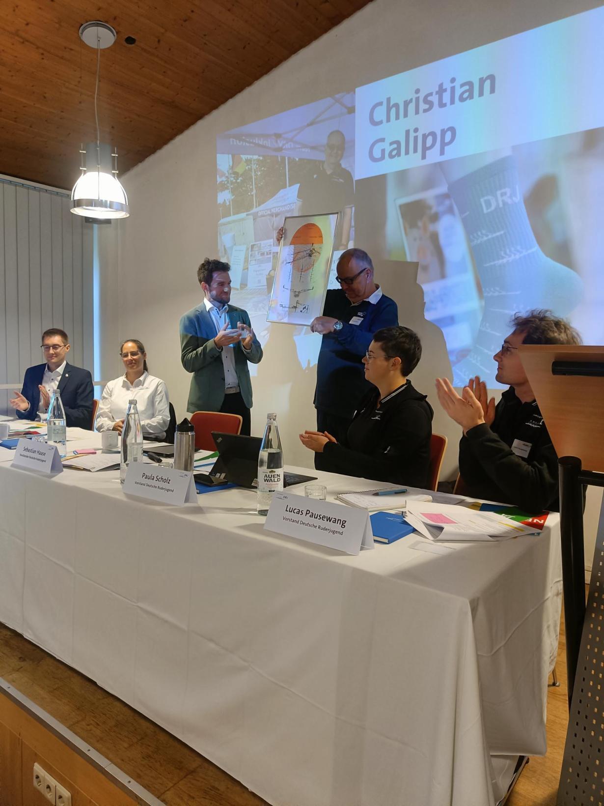 Die parlamentarische Sitzung fand schließlich am Vormittag des Sonntags statt. Mit 37 Delegierten und 112 Stimmen wurde die Sitzung schließlich eröffnet. Zu Beginn gab es Grußworte einiger Ehrengäste, darunter Katharina v. Kodolitsch (Präsidentin des Hamburger Sportbundes und Mitglied im DRV-Präsidium), Dr. Lars Koltermann (DRV-Vorstand) und Andreas Döpper (Vorsitzender des AAC/NRB Landesruderverband Hamburg). Unter dem Tagesordnungspunkt Ehrungen gab es dieses Jahr zwei Auszeichnungen. Christian Galipp wurde für sein Engagement für die DRJ geehrt, insbesondere für seine zahlreichen Pin-Aktionen, sowie für seinen Einsatz für das Olympiacamp in Paris und seine initiierte „Socken-Aktion“, um diverse Spenden für das Camp einzutreiben. Juniorteamer Niklas Kopyciok wurde ebenfalls für sein Engagement ausgezeichnet, da er bereits seit vielen Jahren den DRJ-Förderlehrgang begleitet und auch leitet, jedes Jahr beim BW unterstützt und zuletzt auch beim Olympiacamp in Paris mit dabei war. Es folgten im Anschluss die Berichte des Vorstandes zu den Projekten, die in den letzten beiden Jahren stattgefunden haben. Die Berichte werden in Kürze veröffentlicht.
