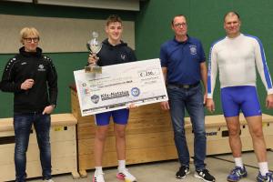 Die B-Junioren aus Schwerin fahren ebenfalls vorne mit. Pepe Jonuscheit wird auf 2.000 Meter Landesmeister und zeigt die beste Juniorleistung. Dafür gibt es einen Pokal und einen überdimensional großen Scheck, der zwar etwas unhandlich ist, aber 250 Euro wert. Eicke Pleß erreicht einen zweiten Platz. Auf den weiteren Plätzen: Leo Jacob (Platz 4), Jordan Lenz (Platz 5) und Oskar Hübschmann (Platz 6). Damit konnten sich fünf Schweriner unter den besten sechs B-Junioren platzieren. Tim Wilke fährt in der B-Junioren Leichtgewichtsklasse als Vierter ins Ziel. B-Juniorin Sofiia Popovych wird nach einem starken Rennen Vize-Landesmeisterin.