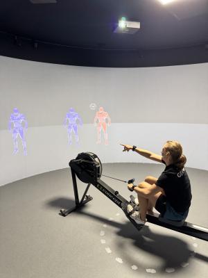 Für das Forschungsteam rund um Dr. Jan Spielmann war es eine Premiere: Zum ersten Mal wurde ein Ruderergometer in die weltweit einmalige „Helix Arena“ — eine 360°-Projektionsumgebung — integriert. Anders als bei sonst üblichen, stehenden Orientierungs- und Aufmerksamkeitsaufgaben mussten die Sportlerinnen und Sportler ihre kognitive Leistungsfähigkeit unter körperlicher Belastung auf dem Ergometer abrufen. „Eine realitätsnahe Simulation“, wie Spielmann betont.