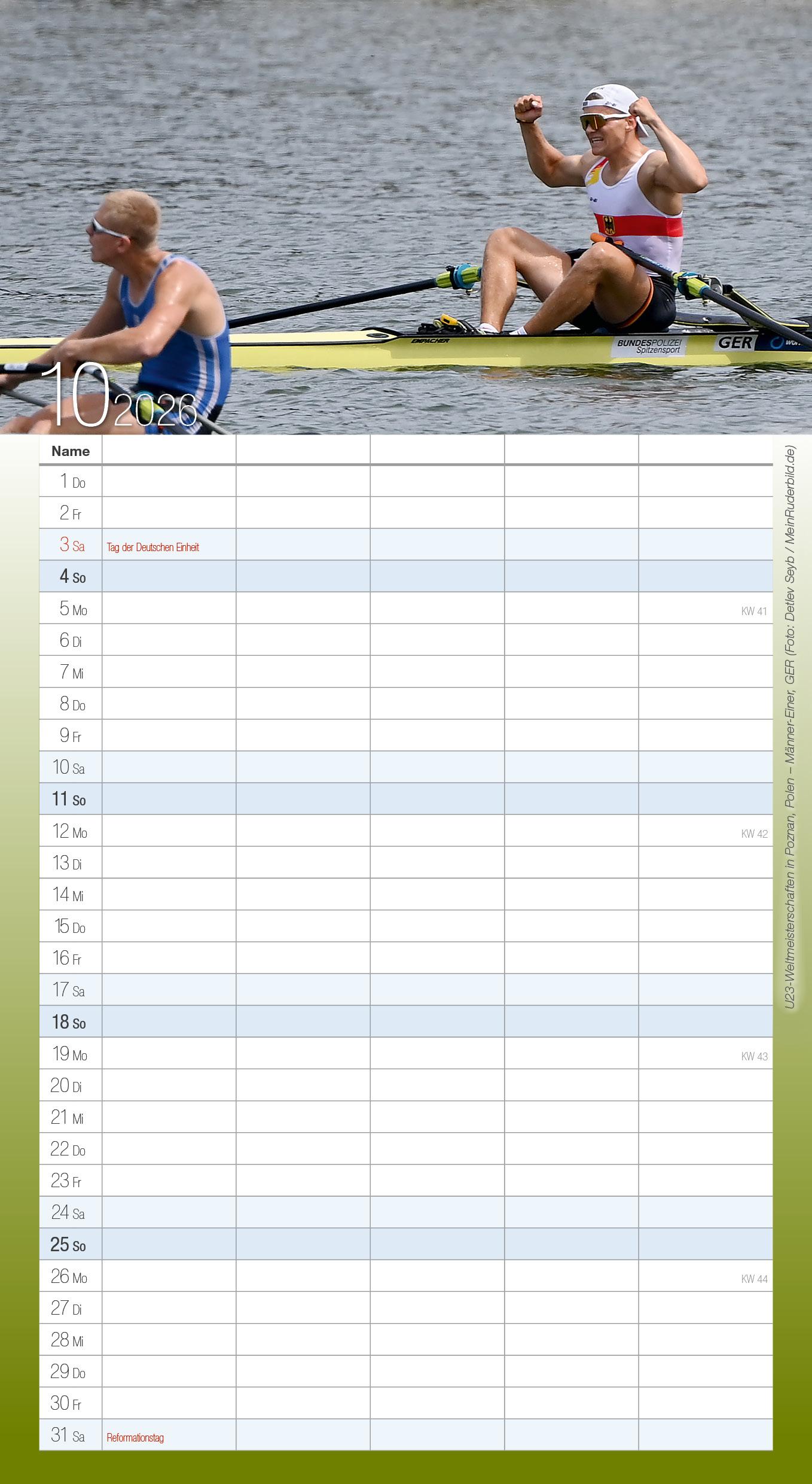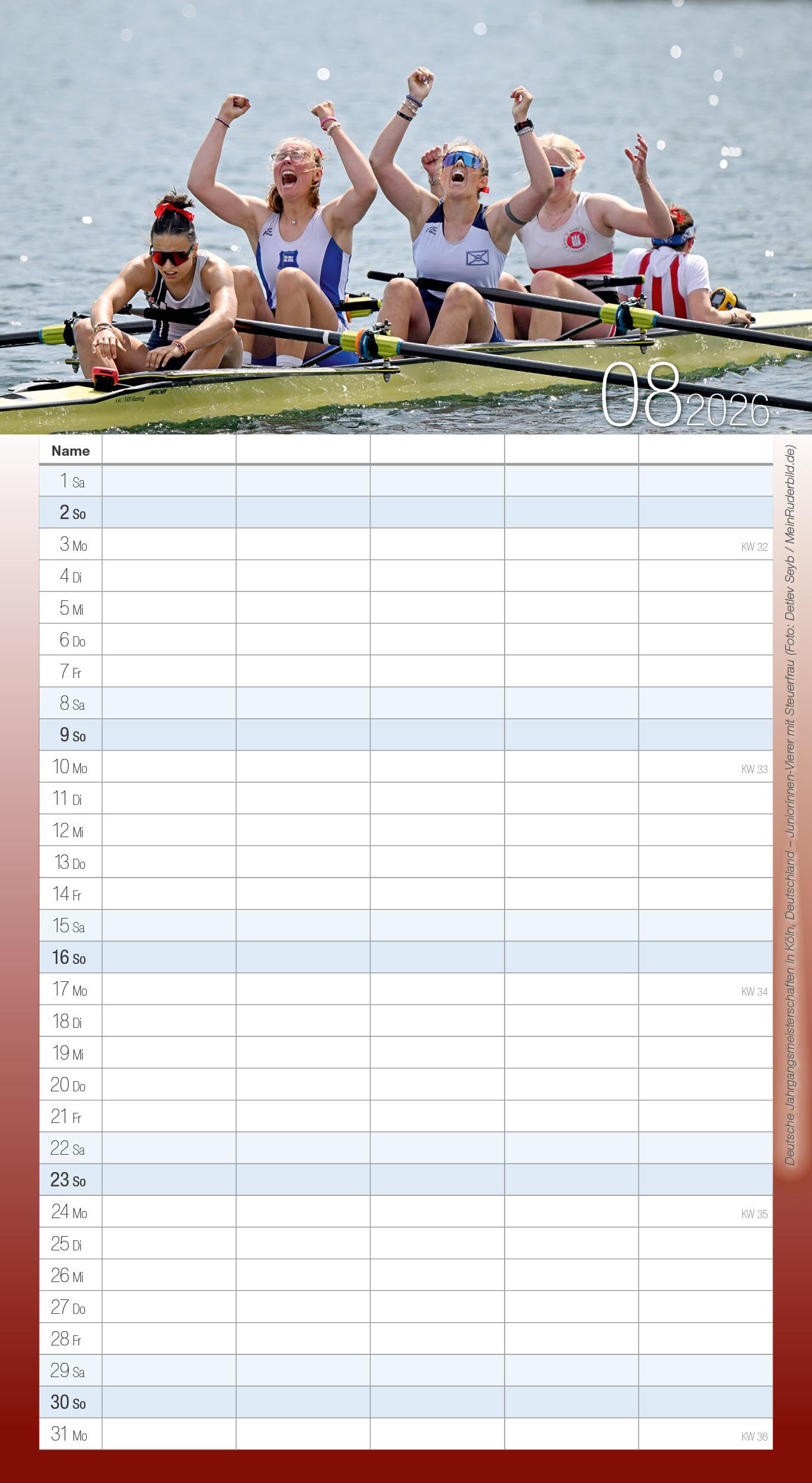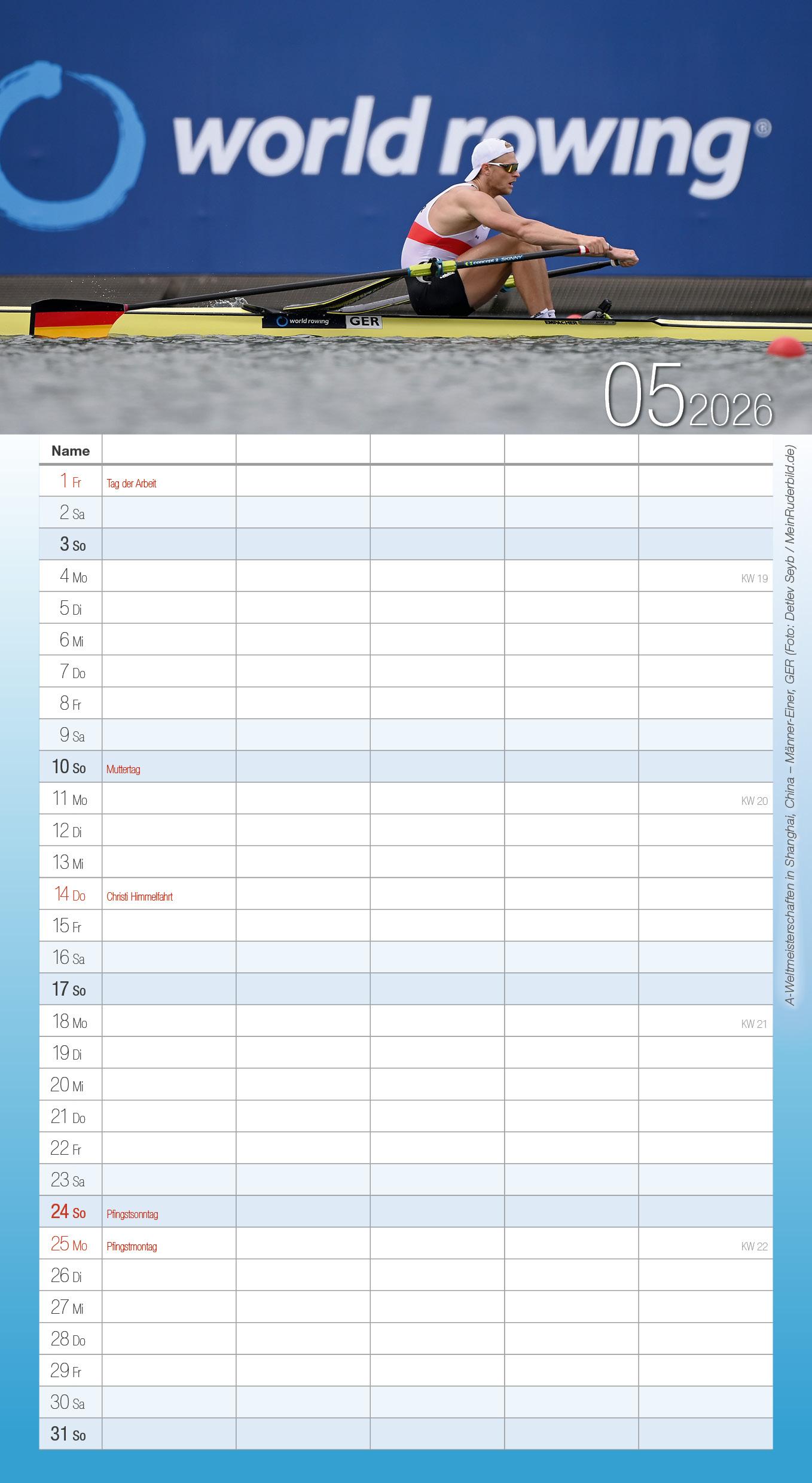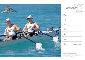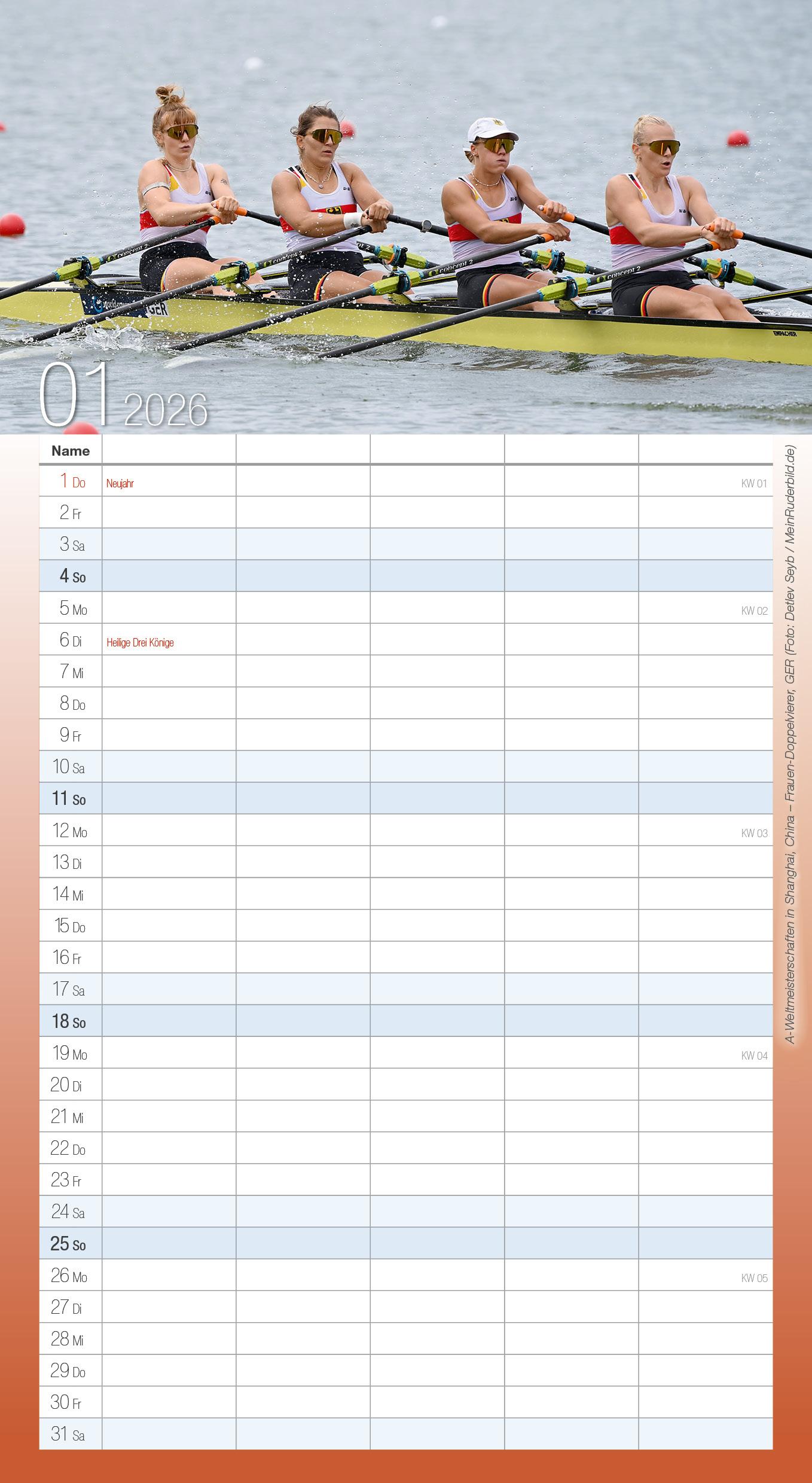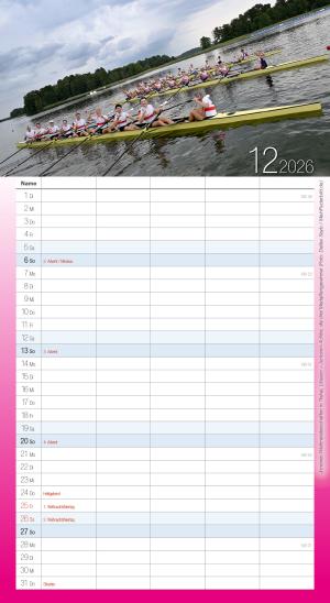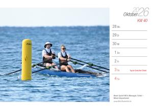 Von den Motiven ebenso abwechselnd wie der Attention – row!-Kalender. Der Wegbegleiter durchs ganze Jahr für die Familie, die auf fünf Spalten ihre persönlichen Termine eintragen kann. Nationale und internationale Ruder-Motive. Der Kalender (im Format 23×42 cm) kostet pro Stück 15,00 € (zzgl. Versandkosten).