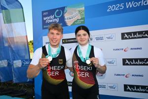 Mit drei Silber-Medaillen in den drei olympischen Bootsklassen schnitten die Junioren des Deutschen Ruderverbandes auch am Samstag bei den Weltmeisterschaften im Beach Sprint hervorragend ab. Felix Krones (USV TU Dresden) musste sich erst im Finale des Junioren-Einers geschlagen geben. Zweite wurde im Juniorinnen-Einer auch Mia Tetiwa (RV Nürnberg), die ihrer Goldmedaille vom Freitag im Doppelzweier nun Silber folgen ließ. Silber holten zum Tagesabschluss auch Miklas Scheer (Erster Kieler RC) und Anna Yuri Koseki (RV Wandsbek) im Mixed-Doppelzweier.