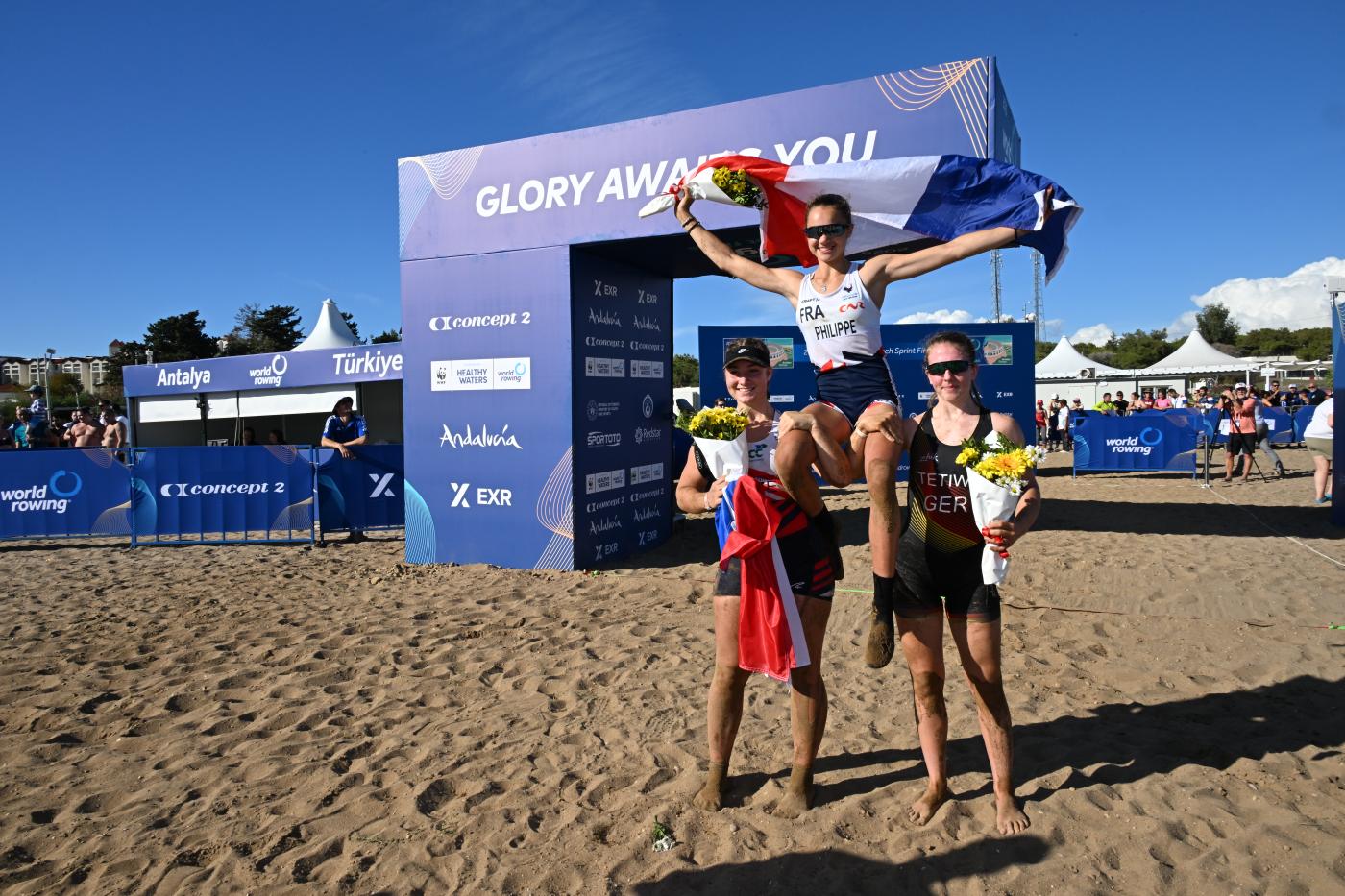 Das Finale im Juniorinnen-Einer war das neunte Sprintrennen für Mia Tetiwa (RV Nürnberg) in drei Tagen – und das erste, das sie nicht als Siegerin beendete. Trotz der hohen Belastung duellierte sie sich im Finale mit Lou Phillipe (Frankreich) fast bis zum letzten Meter um Gold. Beide Athletinnen kamen nahezu gleichzeitig aus der Wende, setzten auf dem Rückweg abwechselnd Akzente und landeten Bug an Bug am Strand. Erst im finalen Sprint über den Sand konnte Phillipe sich knapp absetzen und gewann Gold in 02:47,59 Minuten. Tetiwa kam nur wenig später in 02:49,74 ins Ziel und sicherte sich damit Silber. Damit vervollständigte sie ihre beeindruckende WM, nachdem sie am Vortag bereits Gold im Juniorinnen-Doppelzweier gewonnen hatte. Zwei Starts, zwei Medaillen — ein bemerkenswerter Auftritt der jungen Nürnbergerin, die mit Präzision, Mut und großem Kampfgeist überzeugte.