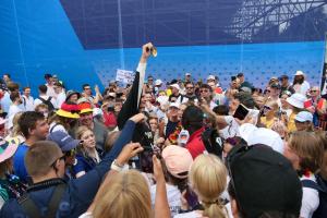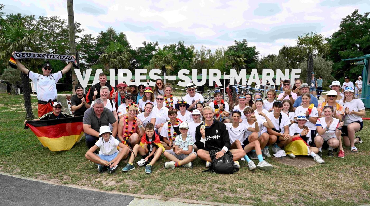 Mit etwas Verzögerung startete endlich das verheißungsvolle Einer-Rennen mit unserem Medaillenkandidaten Olli Zeidler. Mit unseren Schildern, unseren einheitlichen Outfits und unseren Schlachtrufen zogen wir viel Aufmerksamkeit auf uns, sodass wir es auch mehrmals ins Fernsehen, u.a. in die Sportschau, geschafft haben. Dies schien Olli Glück zu bringen und so hielt es niemanden mehr auf den Plätzen als Olli mit viel Vorsprung als Erster das Ziel überquerte. GOLD im Einer. GOLD für Zeidler. Was für Gänsehautmomente für alle, die dabei sein duften und was für ein krönender Abschluss! Olli, herzlichen Glückwunsch zu dieser überragenden Leistung und vielen Dank für deine Zeit für Autogramme und Fotos im Anschluss.