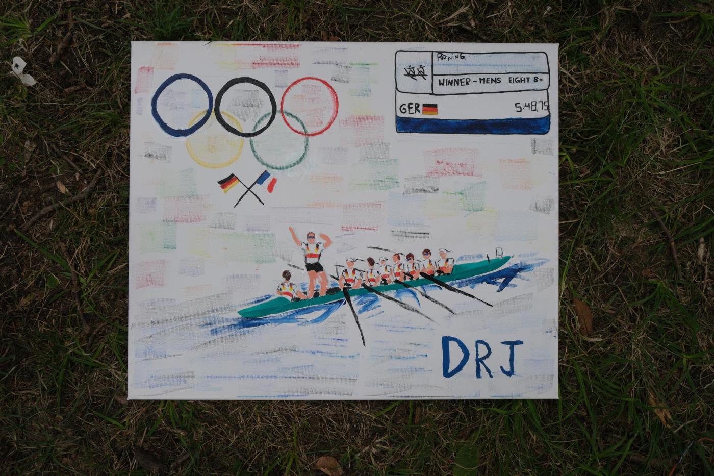 Am Donnerstag ging es vormittags wieder zur Strecke, wo wir den A-Finaleinzug des Deutschlandachters und von Olli Zeidler erleben durften. Nachmittags besuchte uns schließlich die Deutsche Sportjugend (dsj), die jedes Jugendcamp anlässlich der Olympischen Spiele in Paris traf und ein Kunstprojekt mit allen Camps durchführte. Nach einem Workshop zur deutsch-französischen Kultur und den Werten der Olympischen Spiele, bekamen wir eine Leinwand, die es mit Fingerfarben zu gestalten galt. Es sollte, wenn möglich ein sportartbezogenes Bild sein, welches eine bestimmte Situation vergangener Spiele zeigt. Unser Camp entschied sich für London 2012, als der Achter Gold holte und mit einer unglaublichen Zeit von 5:48 Min. ins Ziel einfuhr. Am Ende werden alle Leinwände ein großes Gesamtbild ergeben - wir sind auf das Endergebnis sehr gespannt.