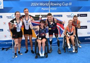 Eine weitere Medaille für den DRV holten Jan Helmich und Hermine Krumbein (RC Hansa Dortmund und RK Normannia Braunschweig) im Finale des PR3 Mixed-Zweiers. Die Beiden holten mit einem gleichmäßigen Rennen Bronze hinter Australien und Großbritannien. „Cool, dass das Feld immer größer wird. Aber drei Rennen in drei Tagen immer mit Gegenwind zehrt an den Kräften“, sagte Helmich. Das Turnier war ein guter Test für die Paralympics. Sportlich ist die Generalprobe ebenfalls gelungen, auch wenn Krumbein das relativ sieht: „Wir haben noch viel mehr Zeit zu arbeiten, als der A-Bereich, und auch noch viel zu tun. Es gibt uns Selbstvertrauen, dass wir heute performen konnten. Wir wollen natürlich noch mehr. Mal sehen, wohin es uns noch führt.“