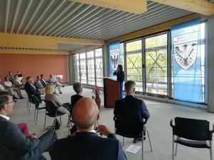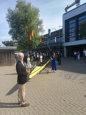 Ratzeburg am 18. August 2022: Rund ein Jahr ist es her, dass die Stadt Ratzeburg und der Deutsche Ruderverband e. V. (DRV) mit dem Spatenstich die Bauphase zu den Umbau-, Modernisierungs- und Erweiterungsarbeiten an der Ruderakademie Ratzeburg eingeleitet haben. Seitdem hat sich viel getan. Am 18. August wurde der Baufortschritt im feierlichen Rahmen beim Richtfest der Ruderakademie einem ausgewählten Publikum präsentiert. Neben der traditionellen Einweihung des Dachstuhls gab es einen weiteren Grund zu feiern: Der neue Stützpunktachter wurde auf den Namen „Karl Adam“ getauft.