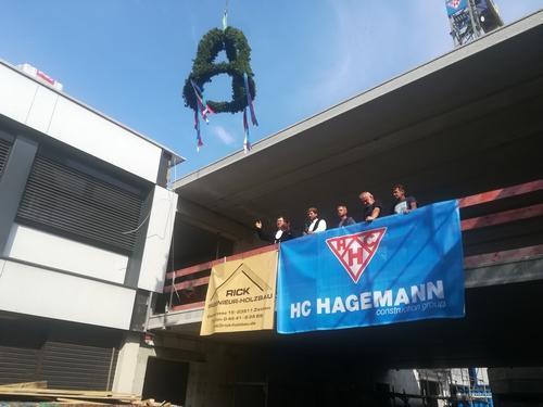 Für das Richtfest wurde ein abwechslungsreiches Programm zusammengestellt. So ging es im Anschluss an die Begrüßung direkt mit dem Richtfestspruch und der traditionellen Einweihung des Dachstuhls weiter. Aufgrund der Größe des Gebäudekomplexes der Ruderakademie wurde dafür der Richtfestkranz nicht am Gebäude befestigt, sondern an einem Baukran in die Höhe gezogen. Der erfahrenste Zimmermann vor Ort, Werner Rick, weihte den Bau mit einem mehrminütigen Richtfestspruch ein und besiegelte diesen mit einem zuvor geleerten und zu Bruch gebrachten Glas. Denn Scherben sollen bekanntlich Glück bringen!