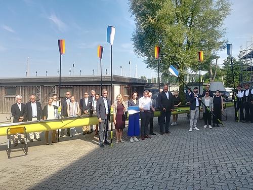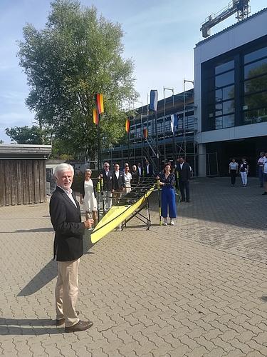 Bevor es zur Baustellenführung und dem Mittagessen ging, wurde das neueste Mitglied der Bootsfamilie willkommen geheißen. Mit einer traditionellen Bootstaufe wurde der neue Achter eingeweiht und nach Karl Adam benannt – dem Mitbegründer des Ratzeburger Ruderclubs und der Ruderakademie Ratzeburg, die er von 1964 bis 1976 leitete. Getauft wurde das Boot von Klaus Ripken, Geschäftsführer der Peter Petersen Stiftung, die den Achter finanziell getragen hat.