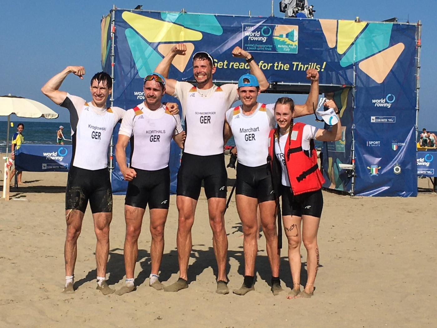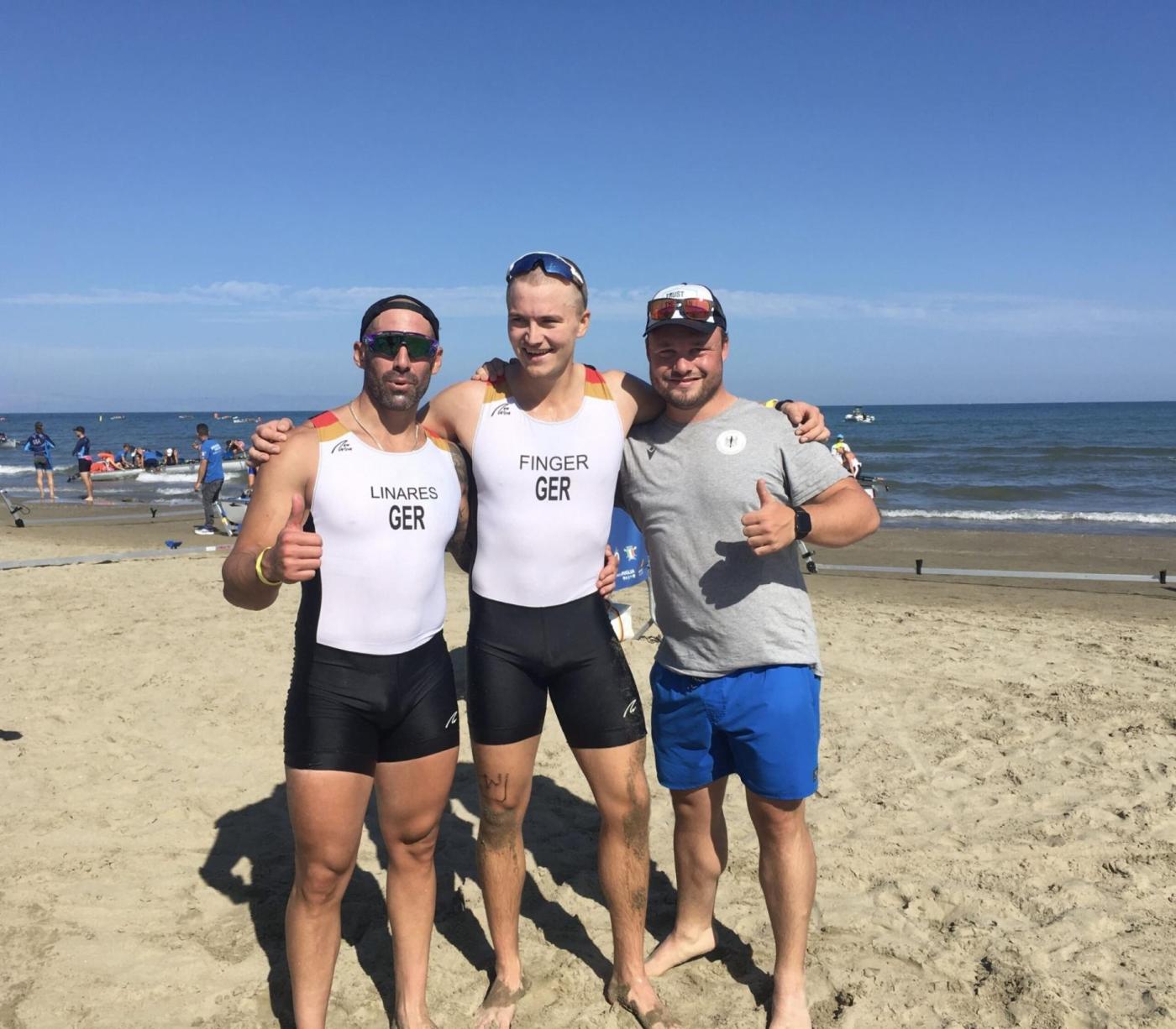 Dabei holte sich der gesteuerte Männer-Vierer der Stuttgarter RG in einem sehr stark besetzten Feld WM-Silber. Moritz Korthals, Emil Schmidberger, Moritz Marchart, Oskar Kroglowski (EKRC) und Steuerfrau Elisa Trog (EKRC) boten eine Spitzenleistung in einem hart umkämpften Rennen. Ein schneller Start der Deutschen verhalf ihnen eine Welle vor dem Hauptfeld zu sein und damit sehr gut ins Rennen zu kommen. Bis zu den strategisch wichtigen ersten zwei Wendebojen hatte sich das deutsche Team unter den führenden Booten platziert. Auch eine leichte Heckkollision konnte Steuerfrau Trog souverän meistern und steuerte ihr Team im dichten Feld durch den mit zehn Wendebojen gesteckten Parcours. Bei der Anlandung am Strand hatte nur ein italienisches Team den Bug leicht vorne und entschied den finalen Sprintlauf für sich. Mit dieser beeindruckenden Performance ließ das deutsche Team selbst die favorisierten Boote aus Monaco, Ukraine, USA, Spanien und Neuseeland hinter sich.