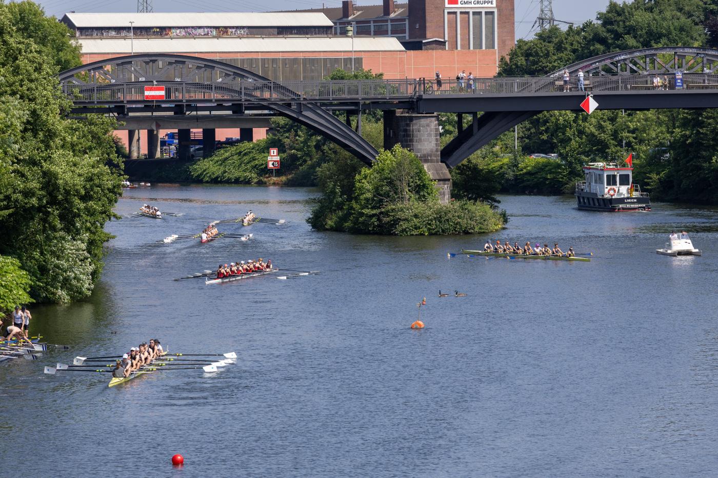 Eine herannahende Gewitterfront, die bereits am Vortag angekündigt worden war und von allen Beteiligten mit Sorge beobachtet wurde, rückte nun unaufhaltsam von Süden aus näher. Die aufziehenden dunklen Wolken boten zwar Schutz vor der brennenden Sonne, führten aber auch zur Entscheidung des Regattastabs, den Zeitplan anzupassen. Mit einer Verschiebung der Halbfinals um 30 Minuten, einer Verkürzung des Rennabstands auf 3 Minuten und dem Start der Finals direkt im Anschluss an den Halbfinal-Block wurde versucht, alle Rennen zwischen zwei Gewitterfronten auf die Ruhr zu bringen. Dieser Plan ging auf, vielleicht aber auch weil der Regattaplatz zwar in Regen getaucht wurde, die Gewitter aber knapp an Mülheim vorbeizogen und der Renntag somit vor Unwetter verschont wurde.