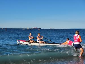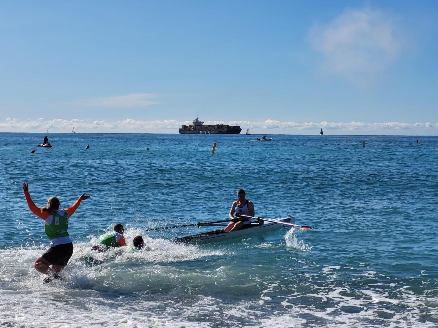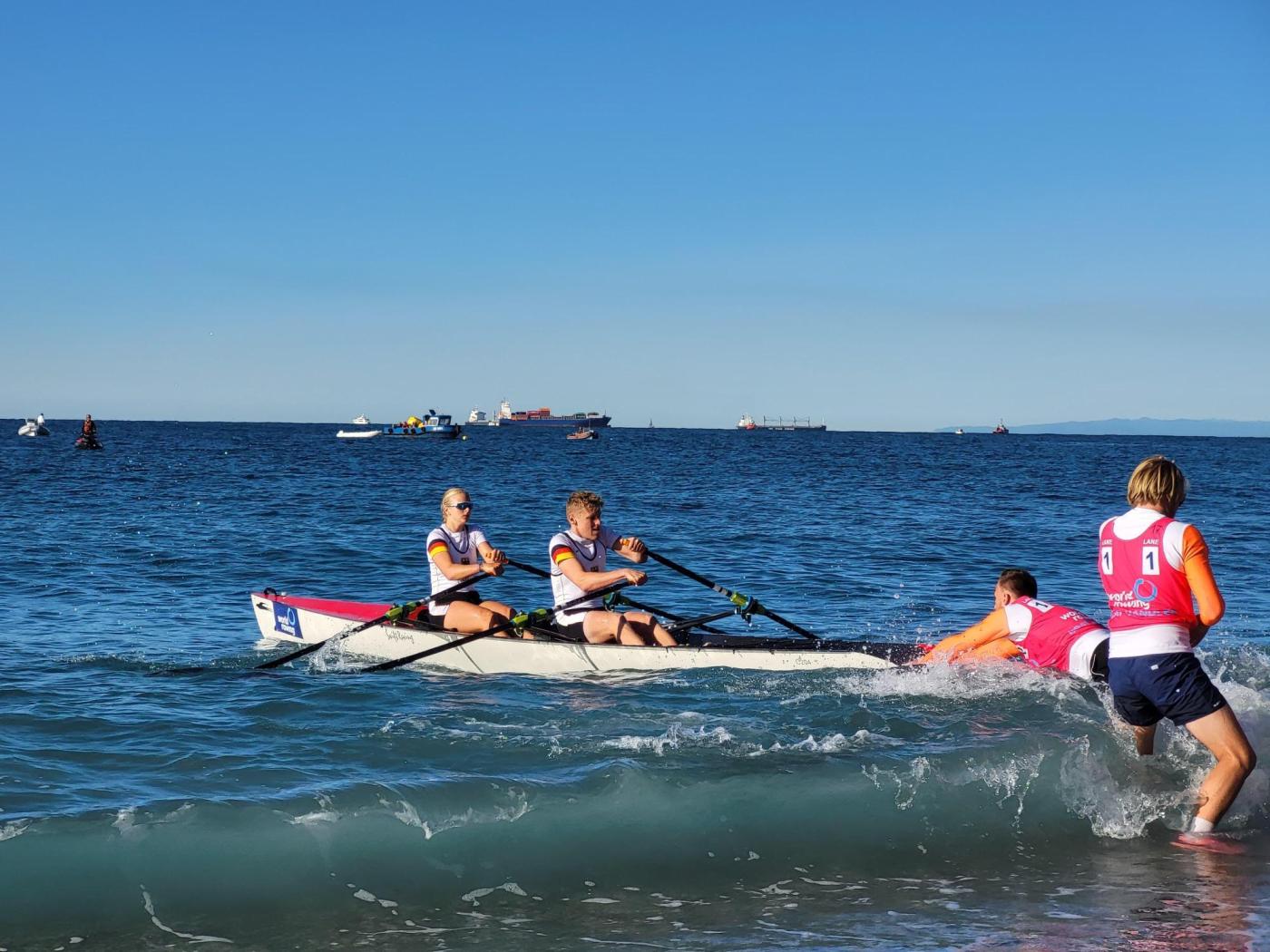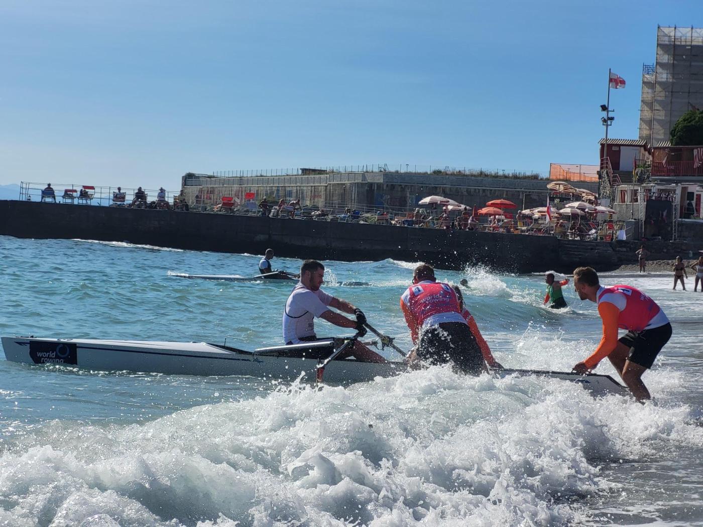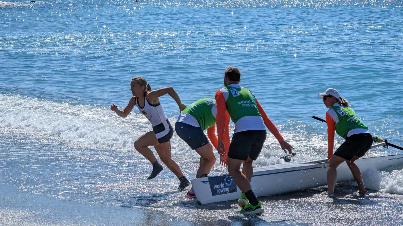 Der zweite Finaltag der World Rowing Beach Sprint Finals (WRBSF) in Genua startete mit vier DRV-Bootsklassen in der Knockout-Runde (Achtelfinale). Den Anfang machte der Junioren Mixed Doppelzweier (CJMix2x). Im Time-Trial war das deutsche Boot als Achtes nur zwei Zehntel schneller als das neuntplatzierte Boot aus Österreich. Nun ging es im direkten Duell um den Einzug ins Viertelfinale. Über die gesamte Strecke war es das erwartete enge Rennen. Fast zeitgleich kamen die Boote wieder auf den Strand zurück und die Entscheidung fiel im finalen Zielsprint (Lauf vom Boot zur Ziellinie) – leider mit dem besseren Ende für das Boot aus Österreich. Damit schieden Gesa Junge (RG Hansa Hamburg) und Mikel Mardaras-Peters (Ulmer RC Donau) in der Runde der letzten 16 Boote aus.