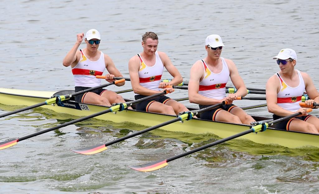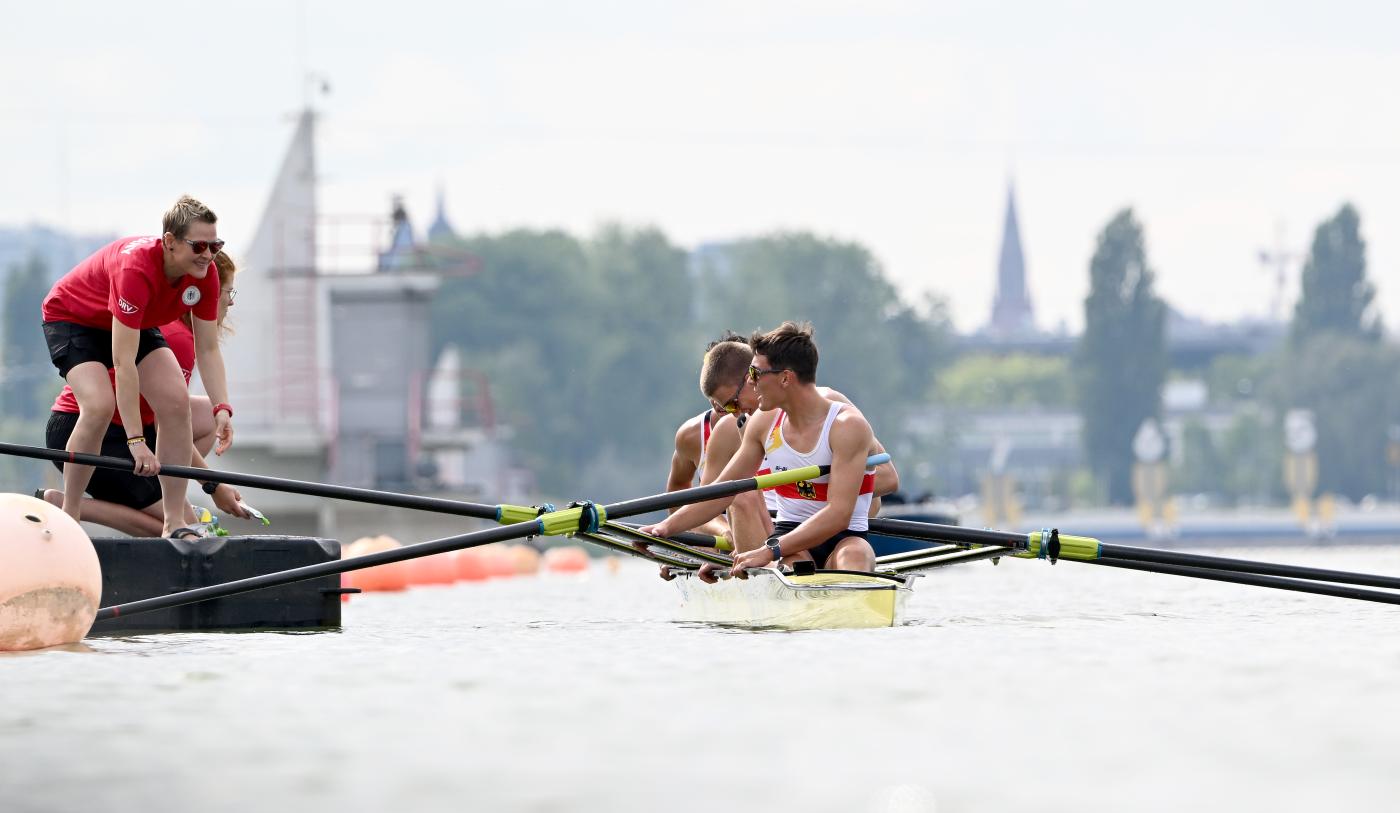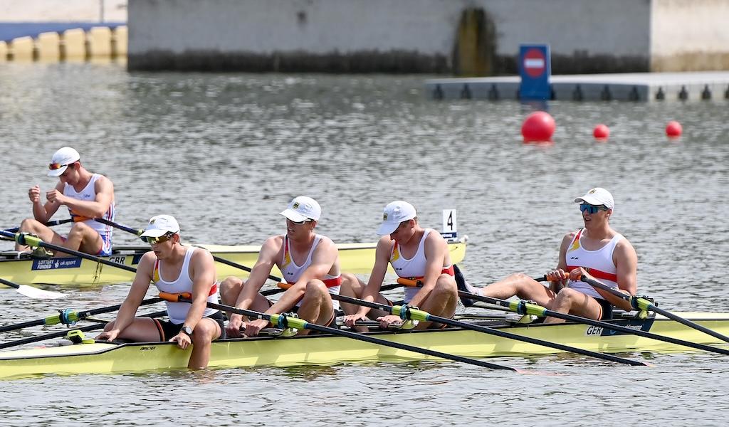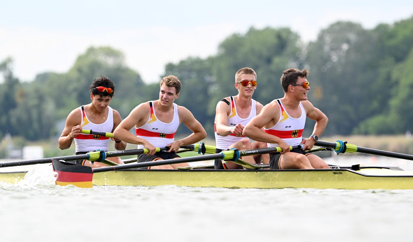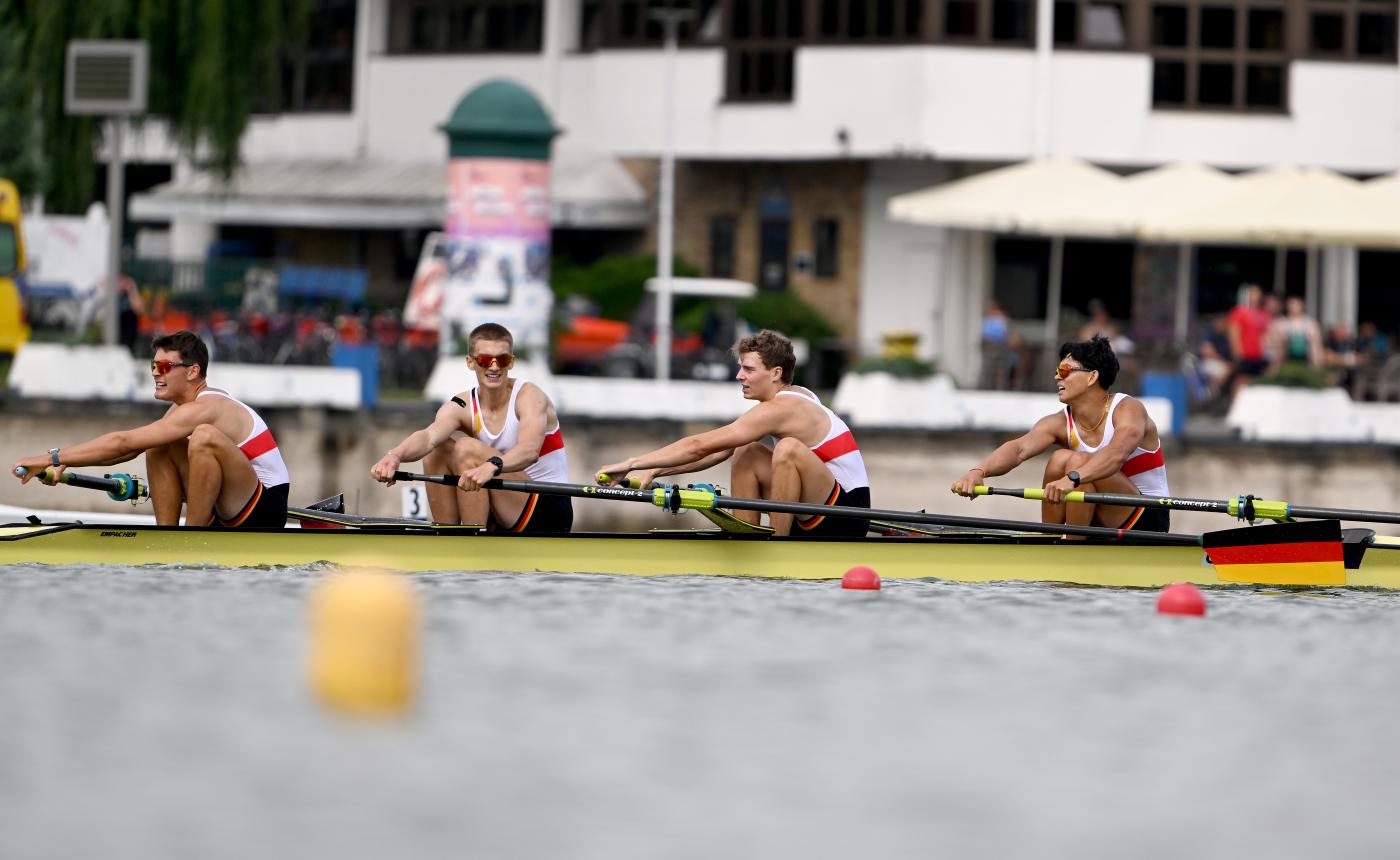 Keno Salzmann, Alvar Flöter, Lars Trampert und Maximilian Brill erreichten mit dem A-Finale im Riemen-Vierer schon mal ein großes Ziel. Im letzten Rennen des Freitags dominierten die USA und gewannen mit großem Vorsprung. Zwischen Rumänien und dem DRV-Boot gab es einen ausdauernden Zweikampf um Platz zwei, den die Rumänen am Ende für sich entschieden. Der dritte Rang für das deutsche Boot geriet auch durch Irlands finale Attacke nicht mehr in Gefahr. Die Freude war groß, nun wartet am Samstag (16:17 Uhr) das A-Finale.