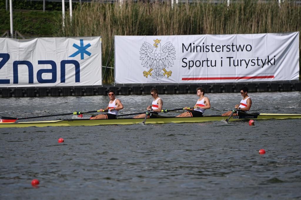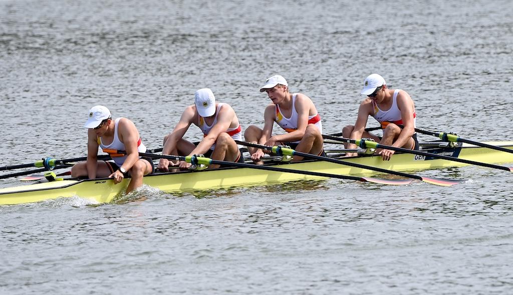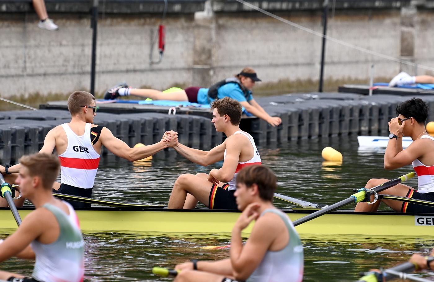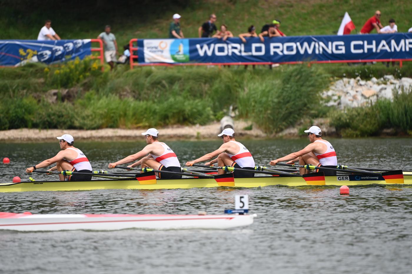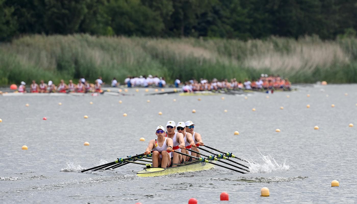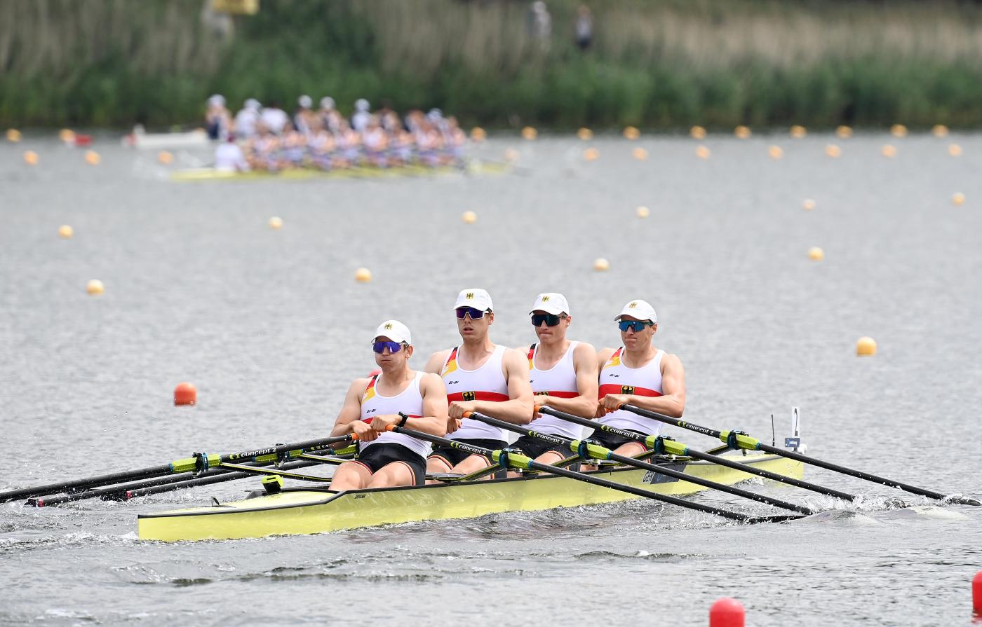 Keno Salzmann, Alvar Flöter, Lars Trampert und Maximilian Brill erreichten mit dem A-Finale im Riemen-Vierer schon mal ein großes Ziel. Im letzten Rennen des Freitags dominierten die USA und gewannen mit großem Vorsprung. Zwischen Rumänien und dem DRV-Boot gab es einen ausdauernden Zweikampf um Platz zwei, den die Rumänen am Ende für sich entschieden. Der dritte Rang für das deutsche Boot geriet auch durch Irlands finale Attacke nicht mehr in Gefahr. Die Freude war groß, nun wartet am Samstag (16:17 Uhr) das A-Finale.