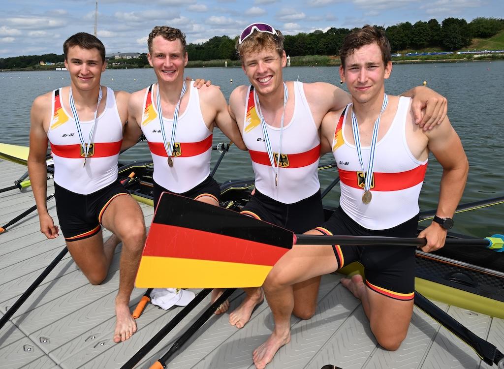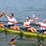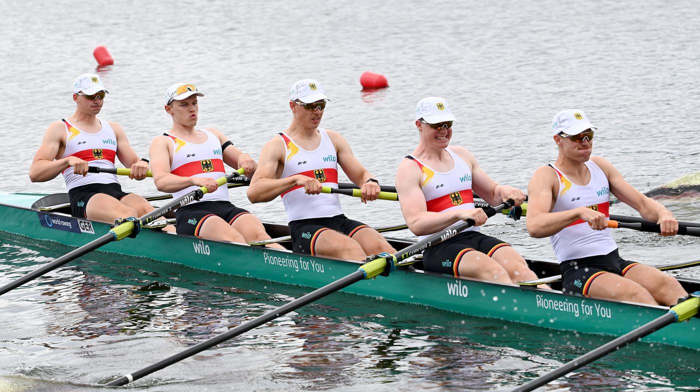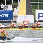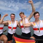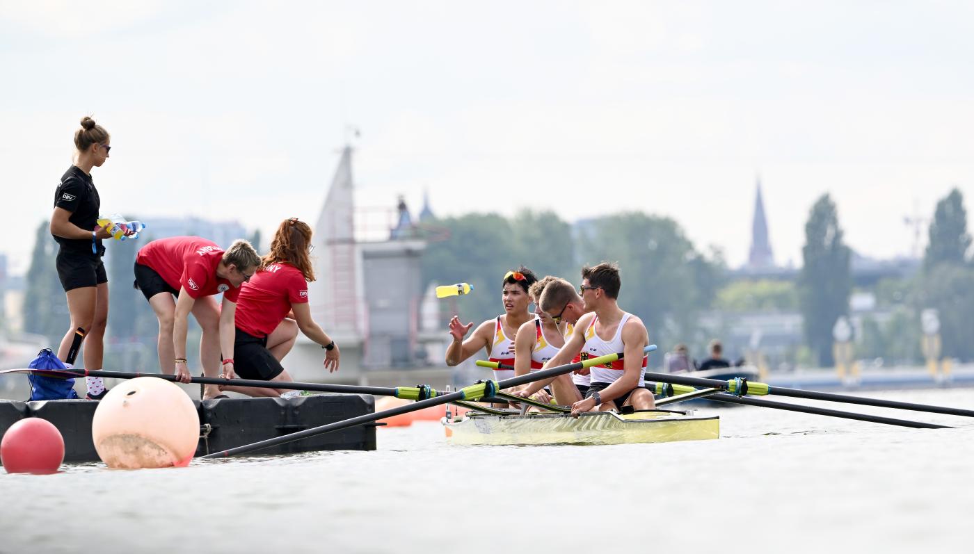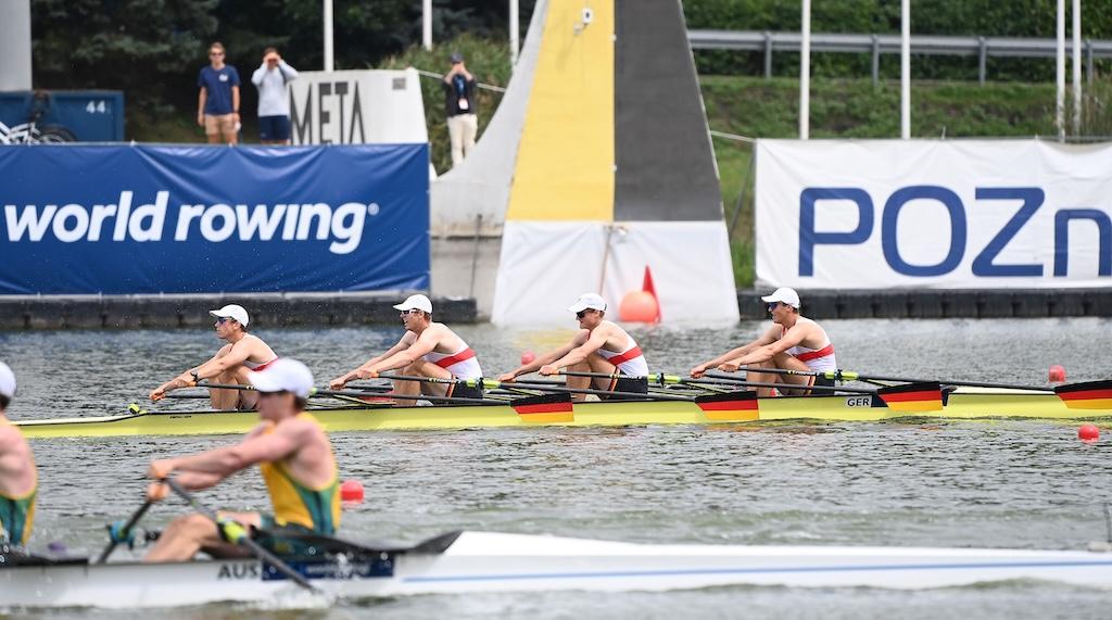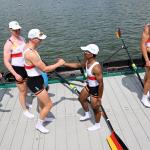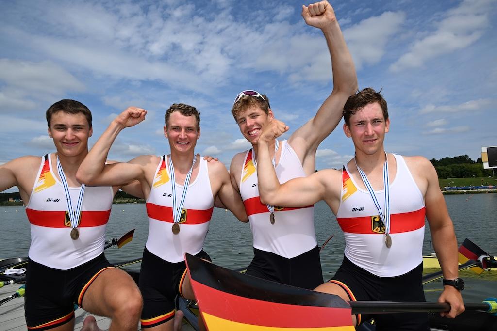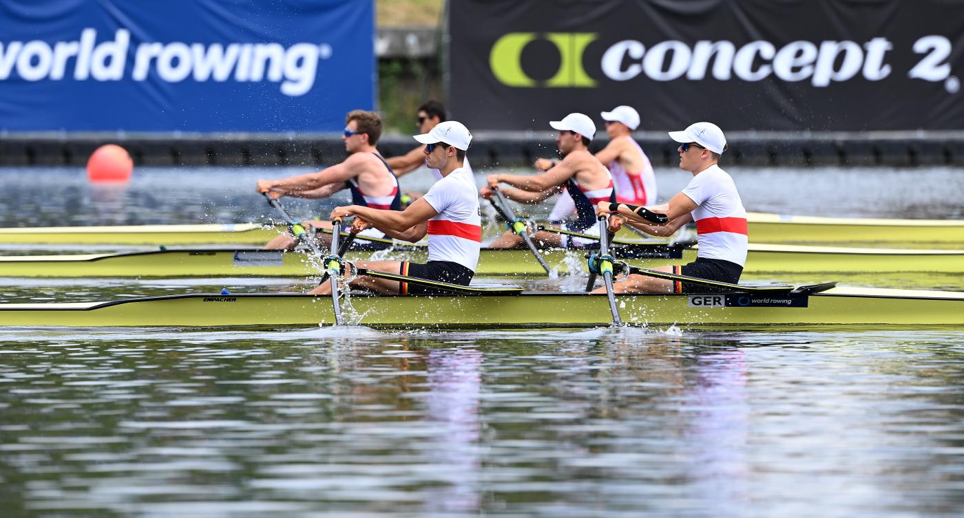 Keno Salzmann, Alvar Flöter, Lars Trampert und Maximilian Brill erreichten mit dem A-Finale im Riemen-Vierer schon mal ein großes Ziel. Im letzten Rennen des Freitags dominierten die USA und gewannen mit großem Vorsprung. Zwischen Rumänien und dem DRV-Boot gab es einen ausdauernden Zweikampf um Platz zwei, den die Rumänen am Ende für sich entschieden. Der dritte Rang für das deutsche Boot geriet auch durch Irlands finale Attacke nicht mehr in Gefahr. Die Freude war groß, nun wartet am Samstag (16:17 Uhr) das A-Finale.