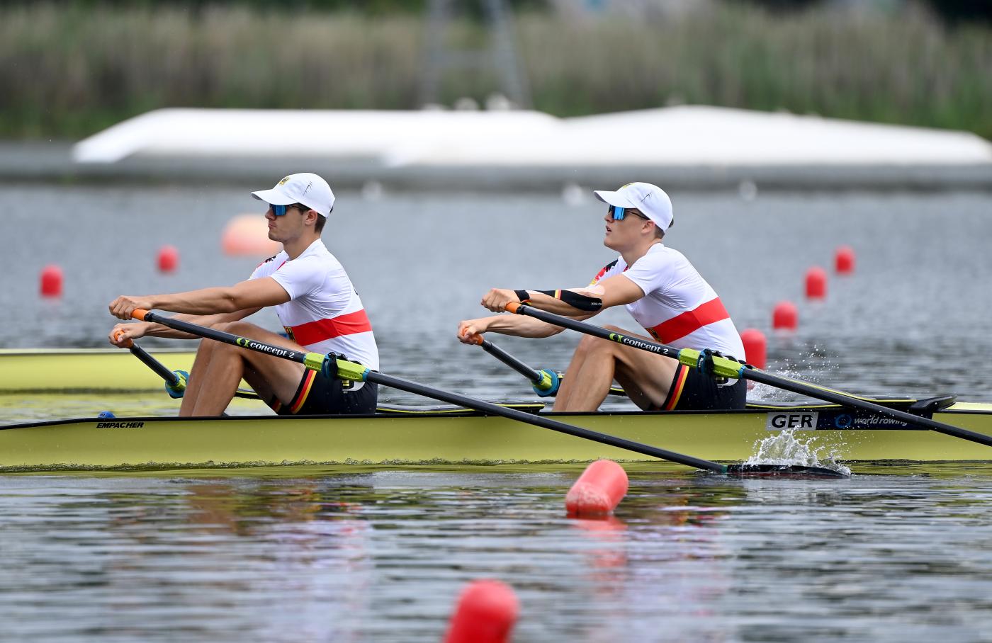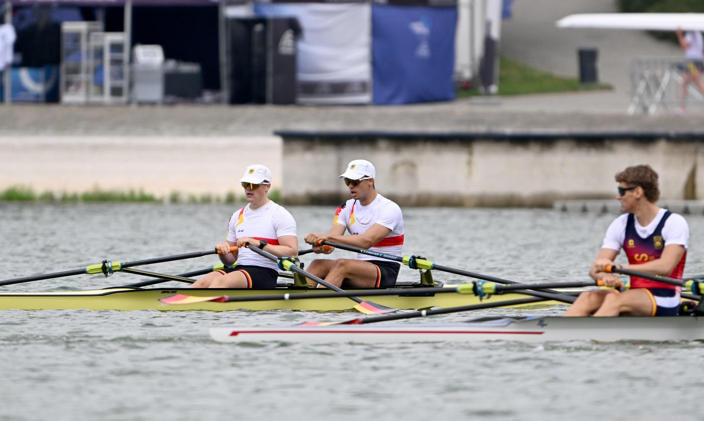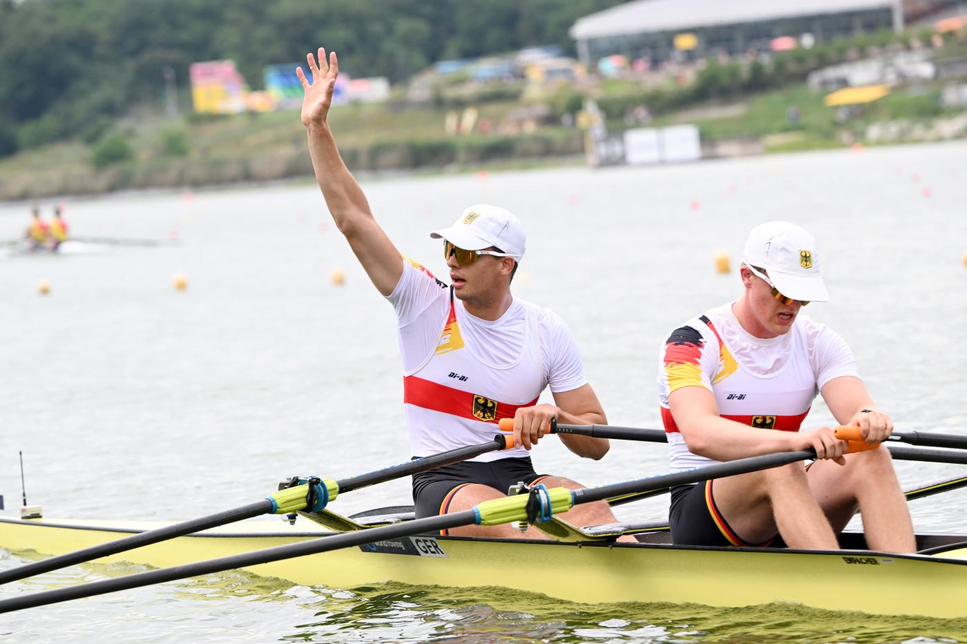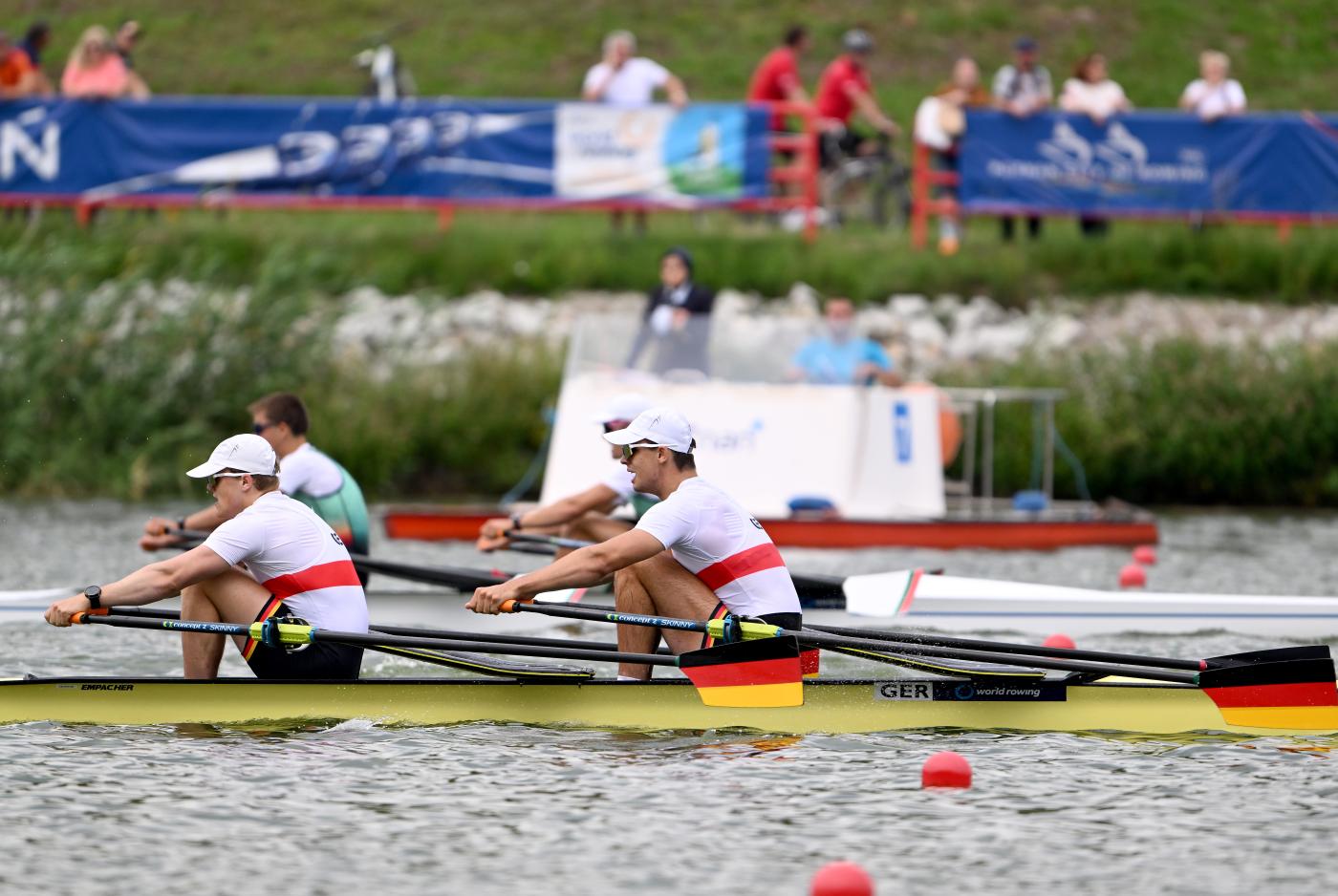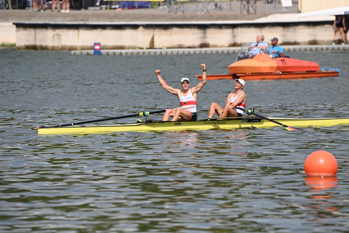 Im zweiten Halbfinale des Männer-Doppelzweiers hatte sich das Trio fürs A-Finale frühzeitig gefunden. Ole Hohensee und Timo Strache wechselten sich mit Portugal und Frankreich in der Führung ab. Am Ende gewannen die Franzosen das Rennen vor Portugal, das deutsche Boot verzichteten nach einem soliden Auftritt auf einen Schlusssprint und wurde Dritter. Im Kampf um die Medaillen am Samstag (15.49 Uhr) ist ein enges Rennen zu erwarten. „Ich denke, dass bei Ole und Timo noch eine Steigerung drin ist“, sagt Bundestrainer Brockmann.