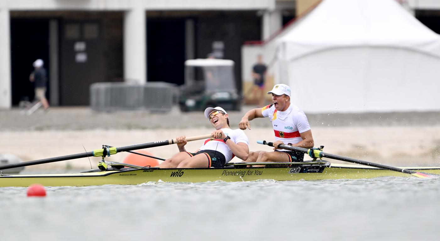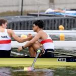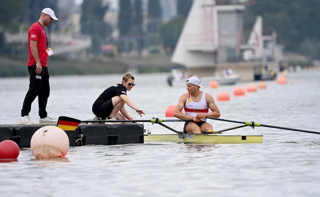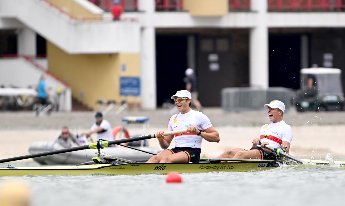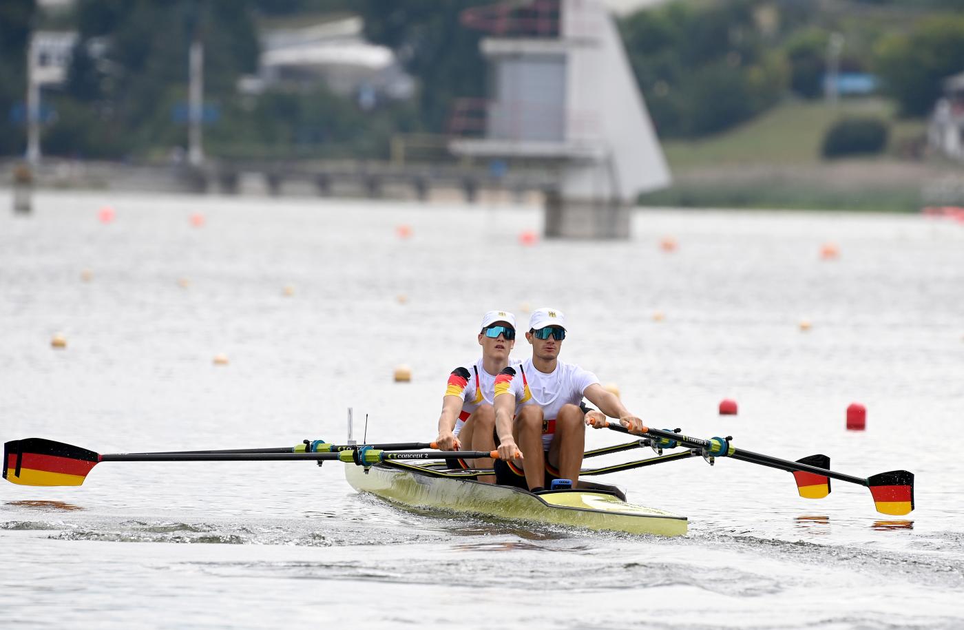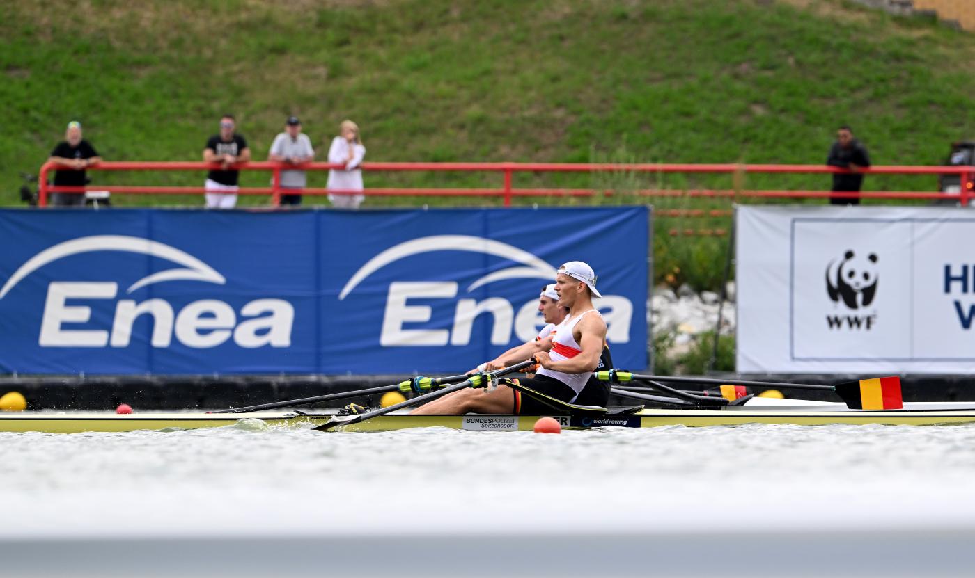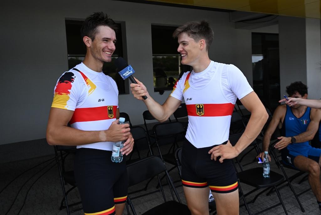 Im zweiten Halbfinale des Männer-Doppelzweiers hatte sich das Trio fürs A-Finale frühzeitig gefunden. Ole Hohensee und Timo Strache wechselten sich mit Portugal und Frankreich in der Führung ab. Am Ende gewannen die Franzosen das Rennen vor Portugal, das deutsche Boot verzichteten nach einem soliden Auftritt auf einen Schlusssprint und wurde Dritter. Im Kampf um die Medaillen am Samstag (15.49 Uhr) ist ein enges Rennen zu erwarten. „Ich denke, dass bei Ole und Timo noch eine Steigerung drin ist“, sagt Bundestrainer Brockmann.