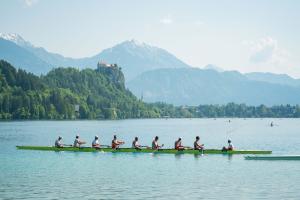 Weil kaum ein Ruderrevier schöner ist. Der kristallklare See, umrahmt von den Julischen Alpen, die berühmte Inselkirche im Wasser und die Burg hoch oben auf dem Felsen – hier wird jede Regatta zum Gänsehautmoment. Moderne Infrastruktur, kurze Wege, zahlreiche Hotels und Restaurants direkt am Wasser machen deinen Aufenthalt angenehm und besonders.