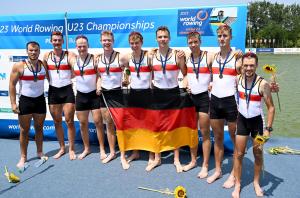 Im letzten Rennen des Wettbewerbs konnten Constantin Conrad, Noah Anger, Jannis Matzander, Jan-Henrik Szymczak, Paul Martin, Ole Bartenbach, Kaspar Virnekäs, Simon Schubert und Steuermann Florian Koch (Dresdner RC/Ulmer RC 'Donau'/RC Favorite Hammonia/Crefelder RC/Kettwiger RG/RG Speyer/Münchener RC/USV TU Dresden Abt. Rudern/Donau-RC Ingolstadt) ihren Plan ein offensives Rennen zu fahren, optimal umsetzen und durch ihre Spurtstärke den dritten Platz hinter den USA und Großbritannien holen. „Es war dann doch ein bisschen überraschend, dass wir dann nochmal so an die USA ran geflogen sind. Das war ein Zeichen, dass wir uns mit Bronze nicht zufriedengegeben haben und versucht haben doch noch Silber zu holen. Das hat dann jetzt mit neun Hundertsteln nicht geklappt, aber damit sind wir trotzdem zufrieden. Das war ein perfekter Saisonabschluss mit einer wichtigen Medaille für den Nachwuchs-Männer-Riemen-Bereich“, Alexander Weihe ist froh über den Ausgang des Rennens.