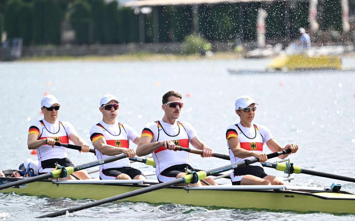 Keine Chance auf den direkten Halbfinaleinzug hatte der Männer-Doppelvierer. Italien war der überlegene Vorlaufsieger, gefolgt von Großbritannien. Auch von Norwegen wurden Anton Finger, Max Appel, Tim Ole Naske und Moritz Wolff (Berliner RC, SC Magdeburg, RG 'Hansa' und Berliner SC) auf den letzten 500 Metern noch überflügelt und somit Vierter vor Litauen. „Es waren schwierige Bedingungen auf Bahn 1 mit dem seitlichen Gegenwind, auf den äußeren Bahnen sind auch Mitfavoriten wie Rumänien und Australien nicht direkt weitergekommen“, sagte Bundestrainer Dirk Brockmann. Bis zur 1000-Meter-Markte attestierte er seinen Schützlingen ein „gutes Rennen, dann sind wir etwas auseinandergefallen.“ Für den Hoffnungslauf ist das Ziel, „mit Rumänien um den Sieg und ein komplett gutes Rennen zu fahren“. China, Kanada und Estland sind die weiteren Gegner, drei Boote kommen ins Halbfinale.