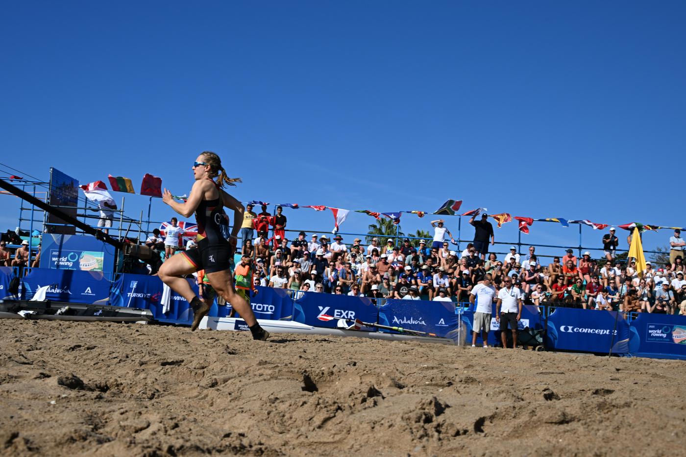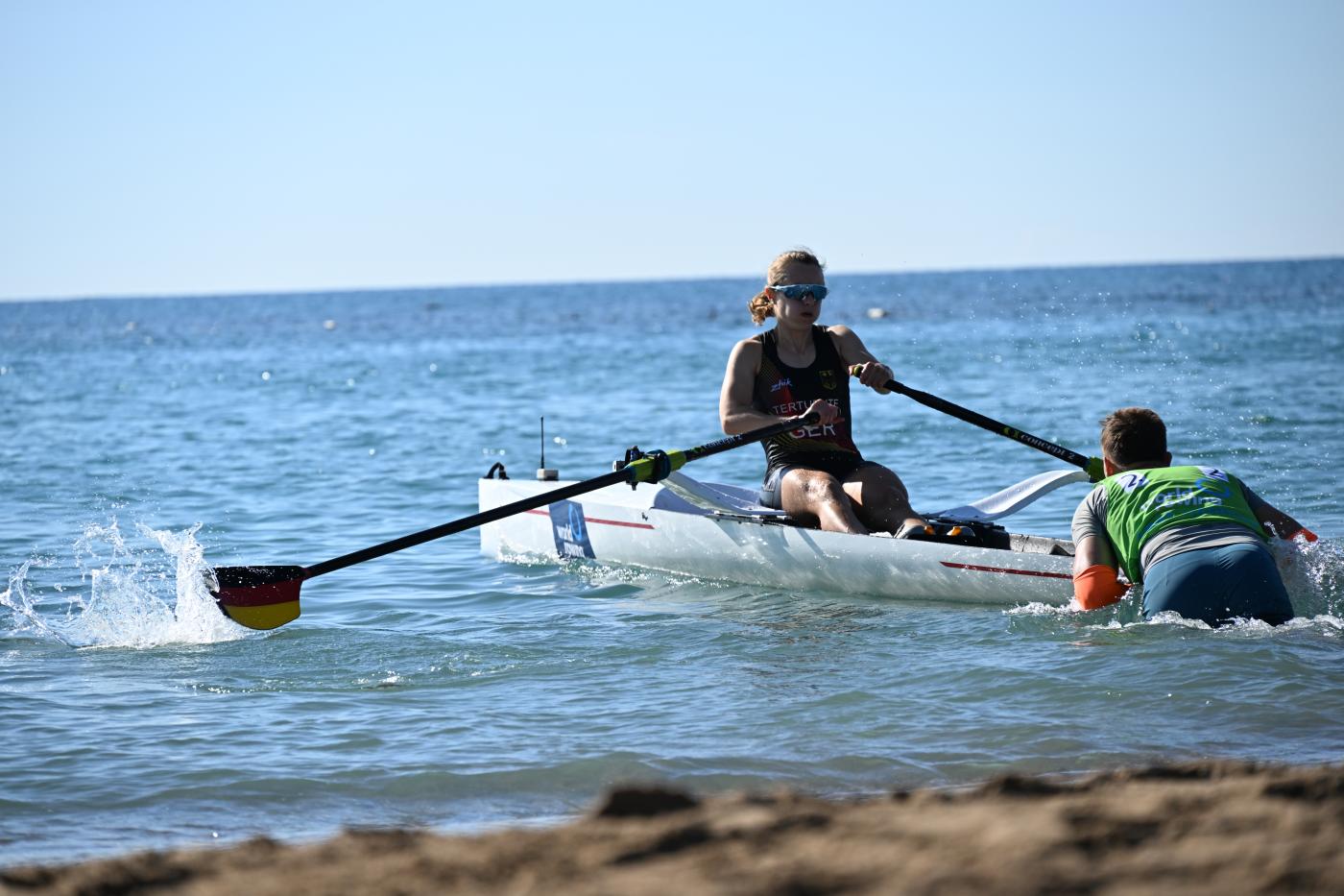 Mit dem Sprung unter die besten Acht der Welt war das erste Ziel schon vorher erreicht. Julia Tertünte (RV Münster) zeigte im Viertelfinale des Frauen-Einers erneut eine engagierte Leistung, musste sich jedoch der erwartet starken Spanierin Teresa Díaz Moreno geschlagen geben. Julia startete gut und hielt das Duell bis zur Wende offen. Dass sie die Ausrichtung des Bootes nach dem Umfahren der Boje korrigieren musste, brachte ihr einen ersten Rückstand ein. Auf dem Rückweg durch die anspruchsvollen Wellen von Manavgat musste Tertünte die Spaniern dann ziehen lassen, nach dem Anlegen am Strand konnte Díaz Moreno locker zum Sieg laufen.