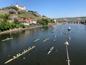Das Frühlingswetter war am 1. Mai phänomenal, da macht es Spaß, zum traditionellen Anrudern des Akademischen Ruderclubs Würzburg aufs Wasser zu gehen. Präsident Andreas Holz zählte neben der Ruderbarke „Schorle Bonn“ 5 Achter, 13 Vierer, 22 Zweier und Einer – eine Armada, die nur die wenigsten deutschen Rudervereine zu Wege bringen können. Rund 160 Ruderinnen und Ruderer saßen in den Booten, vom 10jährigen Kind bis zum Senior Harald Wimmer.