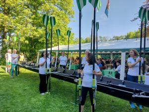 Auf dem Bootsgelände konnte anschließend Sport-Bürgermeisterin Judith Roth-Jörg mit ihrem Mann Wolfgang Roth, der auch Vorsitzender der Würzburger Sporthilfe ist, begrüßt werden. Denn der zweite Höhepunkt des Tages war – umrahmt von den Klängen des Ochsenfurter SAXtetts - die Indienststellung des neuen Flaggschiffes, eines Gig-Achters, der auf den Namen „Werner Kraft“ getauft wurde. Werner und Helga Kraft, die das erfolgreiche Bauunternehmen Kraft führten, waren 7 Jahrzehnte im ARCW und unterstützten auf vielfältige Weise. Sie waren beispielgebend und durch die Bootsbenennung soll der Name Kraft für Jahrzehnte im Club präsent sein.