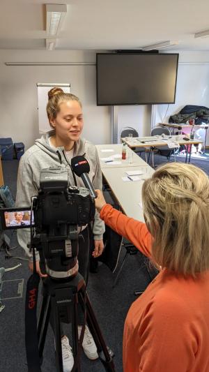 Der größte Teil bestand aber aus Praxisübungen mit Kamera und Mikrofon. Es wurde jegliche Art von Interviews geprobt und simuliert. Den Anfang machten Einzelinterviews, in denen sich die Hoffnungsträger:innen vorstellen sollten. Die meisten sind das erste Mal vor der Kamera gestanden und haben am eigenen Leib erfahren, dass die Kamera zu Anspannung führen kann. Zu Beginn kamen die Antworten noch etwas stockend und schüchtern, aber mit jeder Übung sind die Teilnehmer:innen aufgeblüht.