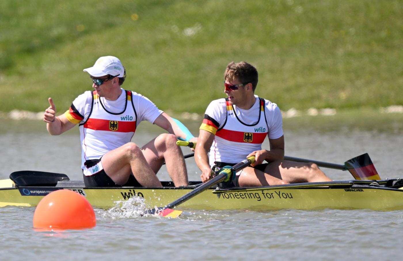 Der Männer-Zweier ohne mit Mark Hinrichs und Marc Kammann (Limburger ClfW und Hamburger UGRC) steht im Halbfinale der Europameisterschaft. Obwohl die beiden Riemen-Reservisten nur wenige gemeinsame Trainingskilometer absolvieren konnten, zeigten sie ein grundsolides Rennen. Der entscheidende Vorstoß gelang ihnen auf dem dritten Teilabschnitt der 2000 Meter, als sie das in neutralen Trikots teilnehmende Boot aus Weißrussland nicht nur vom wichtigen dritten Rang verdrängten, sondern auch einen klaren Vorsprung herausruderten. Spanien und Litauen auf den Rängen eins und zwei waren von Hinrichs und Kammann nicht mehr zu gefährden.