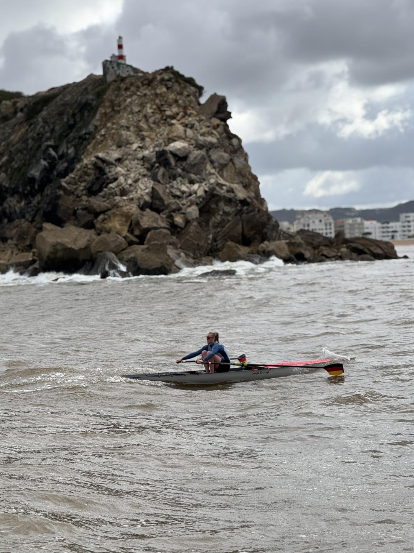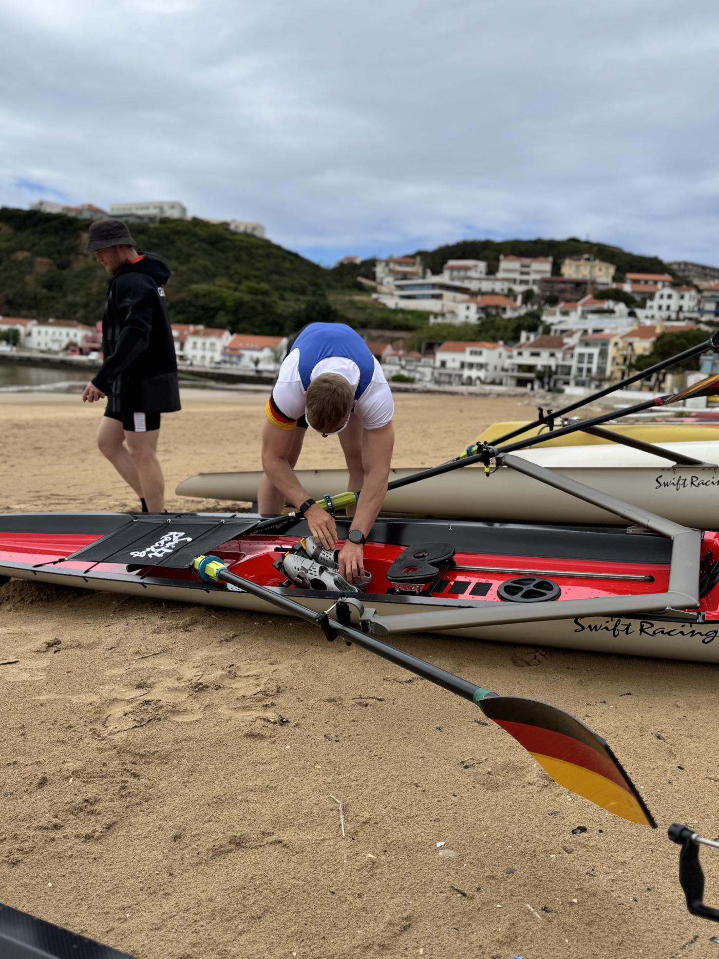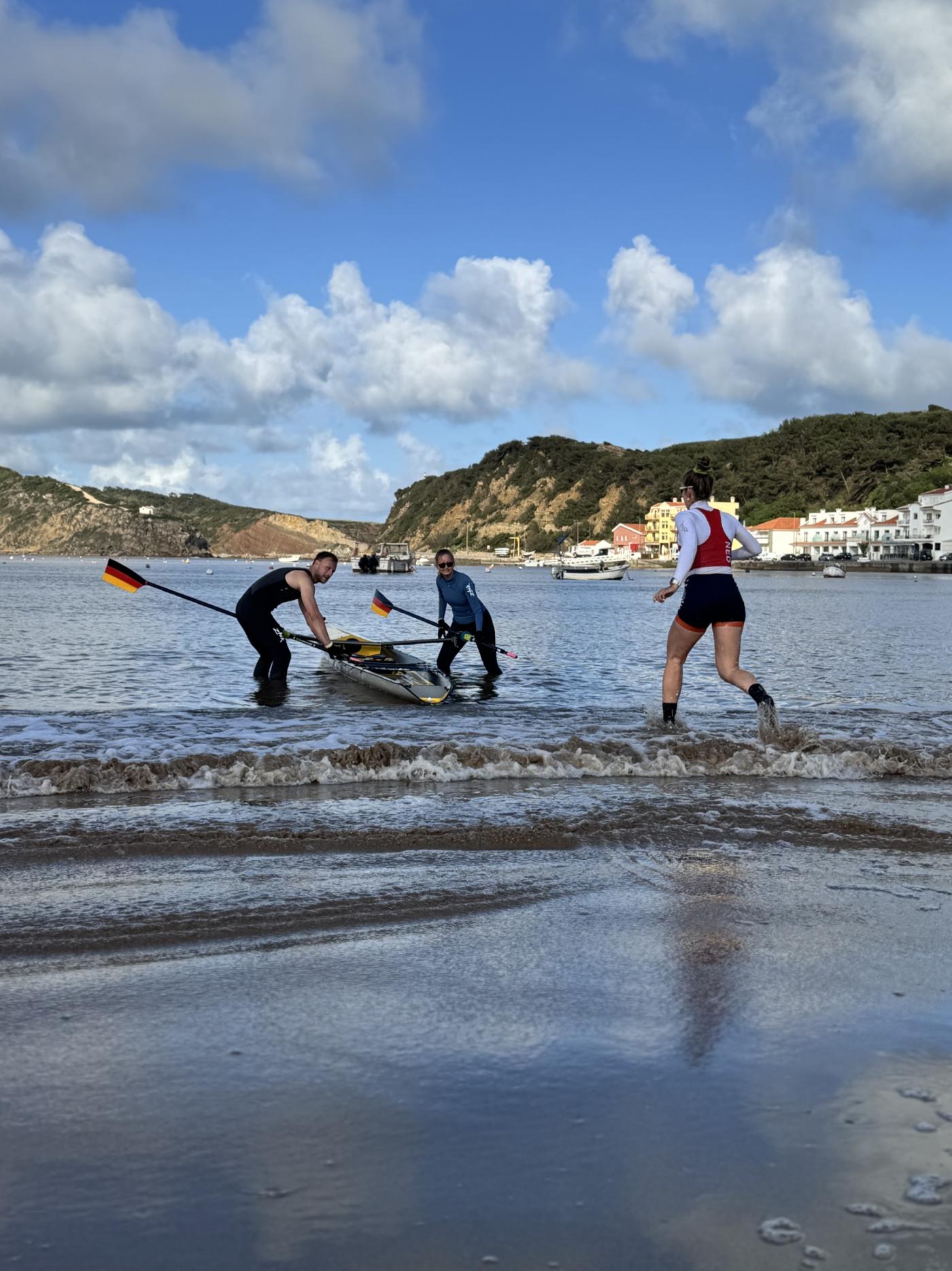 Während dort Riesenwellen für adrenalingeladene Surfbedingungen sorgen, bot die geschwungene Muschelbucht dem Coastal-Team ideale Voraussetzungen: abgeschirmt vom offenen Ozean, aber mit direktem Zugang zu bewegtem Wasser. Disziplintrainer Adrian Bretting zeigt sich begeistert: „In dieser Bucht können wir bei relativ zahmem Wasser gezielt in die unterschiedlichsten Wellen rudern – mal sanfte, mal kräftige Brandung, um das Navigieren der Boote bei echten Bedingungen zu schulen. Für uns der optimale Ort, um die rudertechnischen Herausforderungen und Bewegungsabläufe im Beach Sprint zu schulen. In Portugal stand diese Art des Trainings klar im Mittelpunkt. Im Gegensatz zu unserer ersten Maßnahme Anfang März in Italien, standen nun keine internen Ausscheidungsrennen an.“