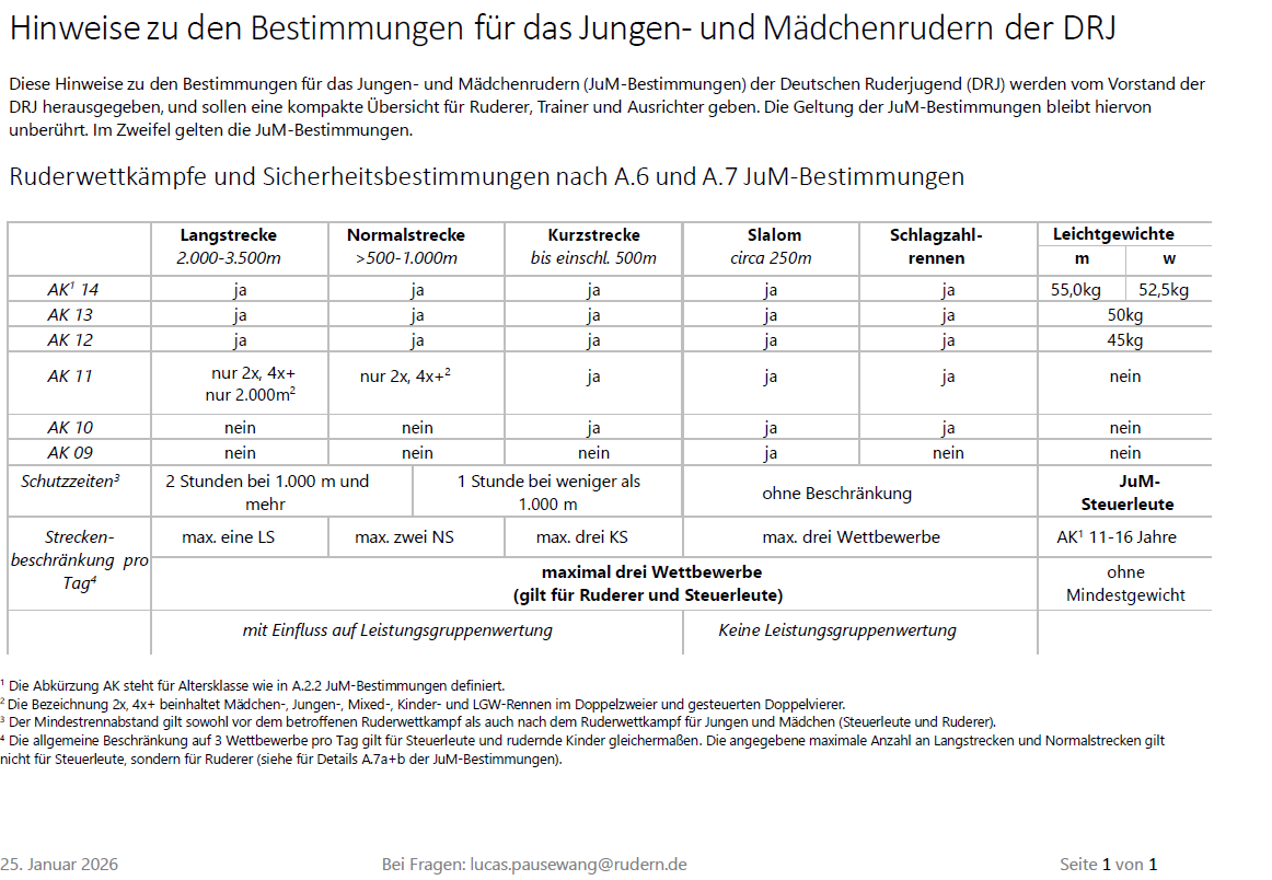 Hier findet ihr die aktuellen Bestimmungen für das Jungen- und Mädchenrudern der DRJ (Kurzform: Best-JuM), die das maßgebliche Regelwerk für alle Wettkämpfe für alle Sportler*innen im Rudersport der Altersklassen 14 Jahre und jünger darstellen.