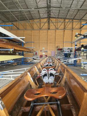 Zum Verkauf steht ein gelbes VEB Yachtwerft Rennboot, Baujahr 1987. Das Boot bietet Platz für 9 Personen (8 Ruderer + Steuermann/-frau) und ist für eine Gesamtbelastung von bis zu 810 kg ausgelegt.