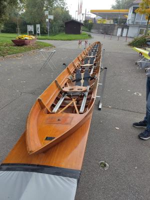 Das Boot ist fahrbereit. Das Baujahr ist unbekannt (60er/70er?). Der Achter hat sowohl Riemen-, als auch nachgerüstete Skullausleger und Flex-Foot-Stemmbretter, kann also im Breitensport gut eingesetzt werden. Das Boot ist nicht teilbar! Standort ist Bad Wimpfen am Neckar
