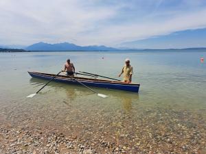 Ausstattung: Karbon-Kevlar-Rumpf, Holz-Innenausbau, Holz-Rollsitze mit Löchern, begehbare Böden auf den Ruderplätzen, Rollbahnschienen aus Aluminium, Stemmbretter mit BB-Heelflex, Stemmbrettverstellung Kunststoff-Raster-Schiene, Alu-2Streben-Ausleger mit BB-Bügeldollen Bugleine, Skulls Big-Blade, Kunststoffgriffe, Auftriebskörper aufblasbar. Baujahr 2012, wenig ausgefahren, als Hobby betrieben. Lagerung ganzjährig sonnen- und wettergeschützt in einer Bootshütte in Chieming (Chiemsee); dieser kann auch übernommen werden (ca. 290€/Jahr). Unser Boot hätte im Oktober 2024 in dieser Ausstattung 10400 Euro gekostet.