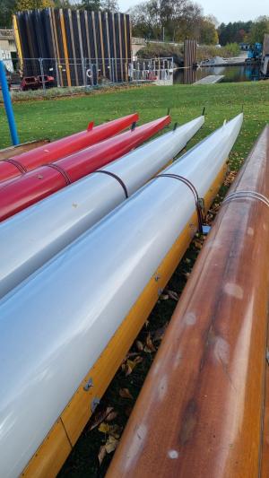 Alle vier Boote zusammen für 1000 Euro. Die weißen Boote sind kombinierte Boote. 4x+ / 4+ mit liegenden Steuermann. 65 und 70kg Mannschaftsgewicht. Die beiden roten Boote 4x+ mit sitzendem Steuermanm 70kg.