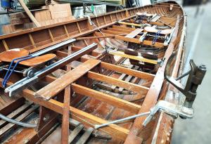 Wunderschöner Yole Inrigger, gebaut von der renommierten Pirsch Bootswerft Berlin Spandau. Ein klinkergebautes Holzboot, ideal zum Rudern lernen. Das Boot ist dicht und unbeschädigt, könnte aber etwas Zuwendung gebrauchen, um wieder in Topzustand zu gelangen. Wir verkaufen es nur aus Platz-, Zeit- und Freiwilligenmangel – sonst hätten wir es sehr gerne behalten. Gekauft wie gesehen.