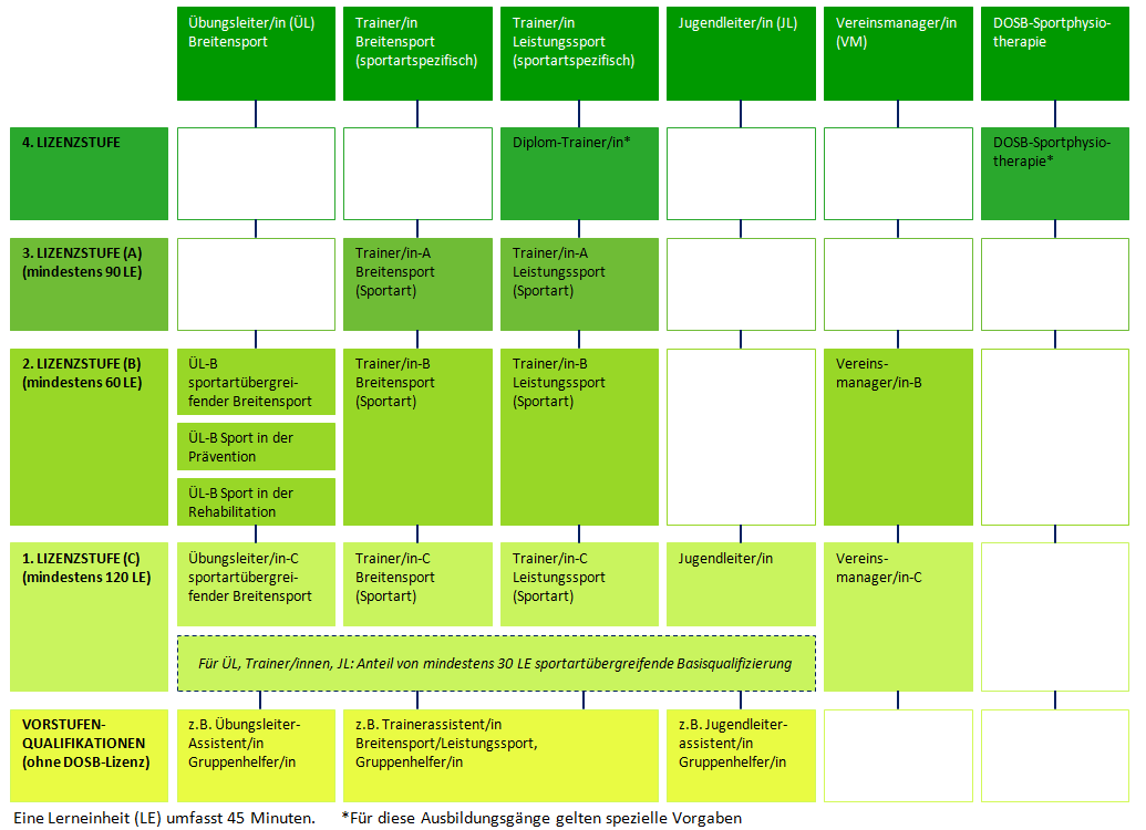Die Ordnung zur Qualifizierung von Trainerinnen und Trainern im Deutschen Ruderverband sieht folgende Ausbildungen vor, dabei umfasst eine Lerneinheit (LE) 45 Minuten: