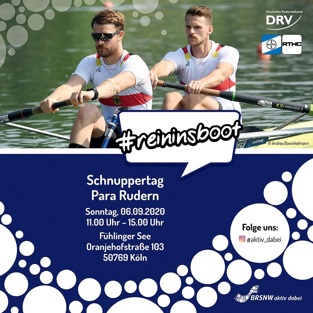 Am 06.09.2020 heißt es auf dem Gelände des RTHC Bayer 04 Leverkusen e.V. wieder #reininsboot. Zum zweiten Mal findet dort ein Schnuppertag Para Rudern statt. Dabei können alle interessierten von 11-15 Uhr Para Boote ausprobieren und sich mit Trainern und Athleten vor Ort unterhalten. Natürlich werden die Sicherheitsbestimmungen des Vereins und der Stadt Köln im Umgang mit dem Corona Virus eingehalten. Daher ist die Teilnehmerzahl leider auf 10 Personen begrenzt. Eure kostenlose Anmeldung und alle weiteren Fragen richtet ihr einfach per Mail an Lina Neumair: neumair@brsnw.de
